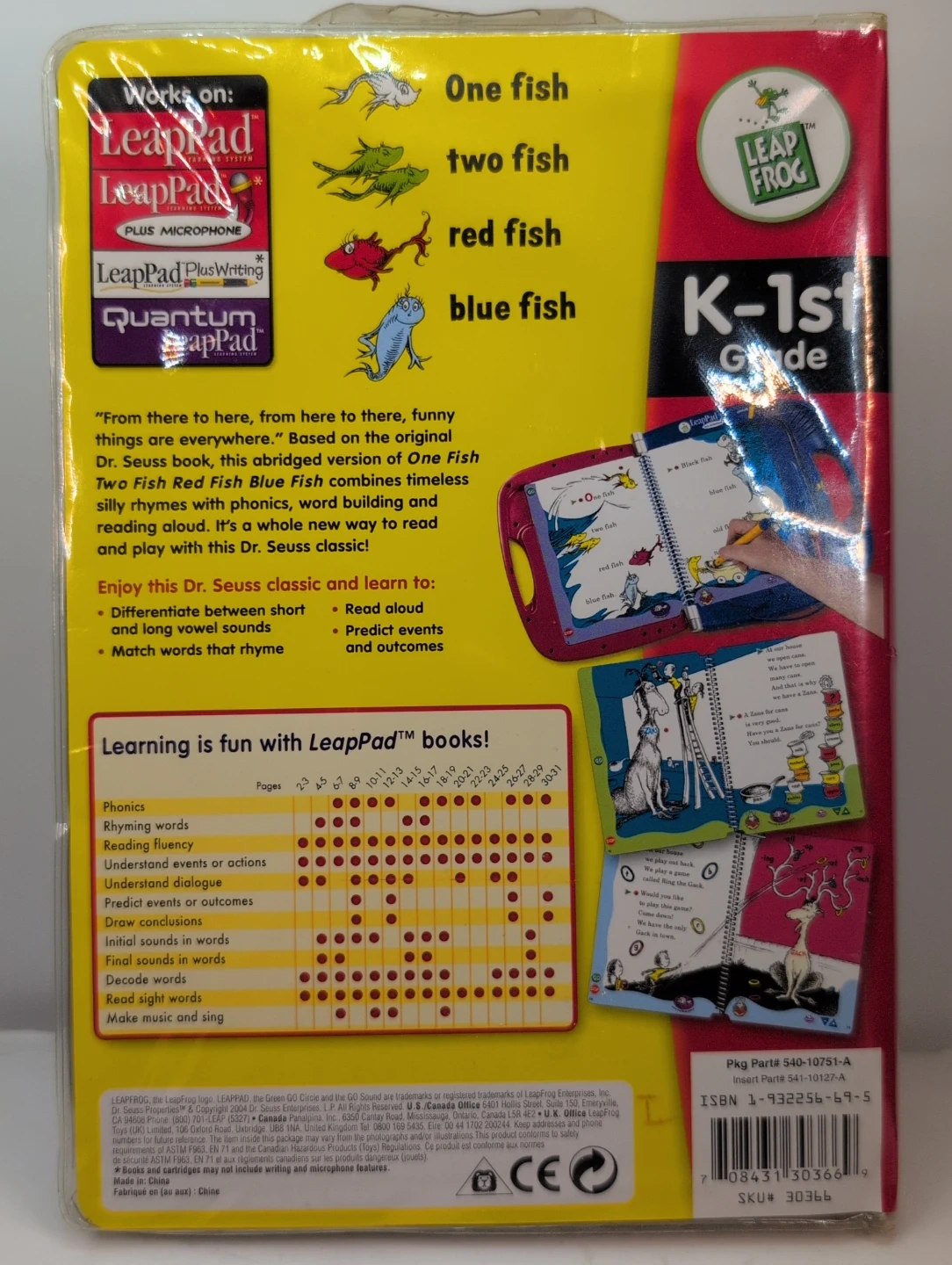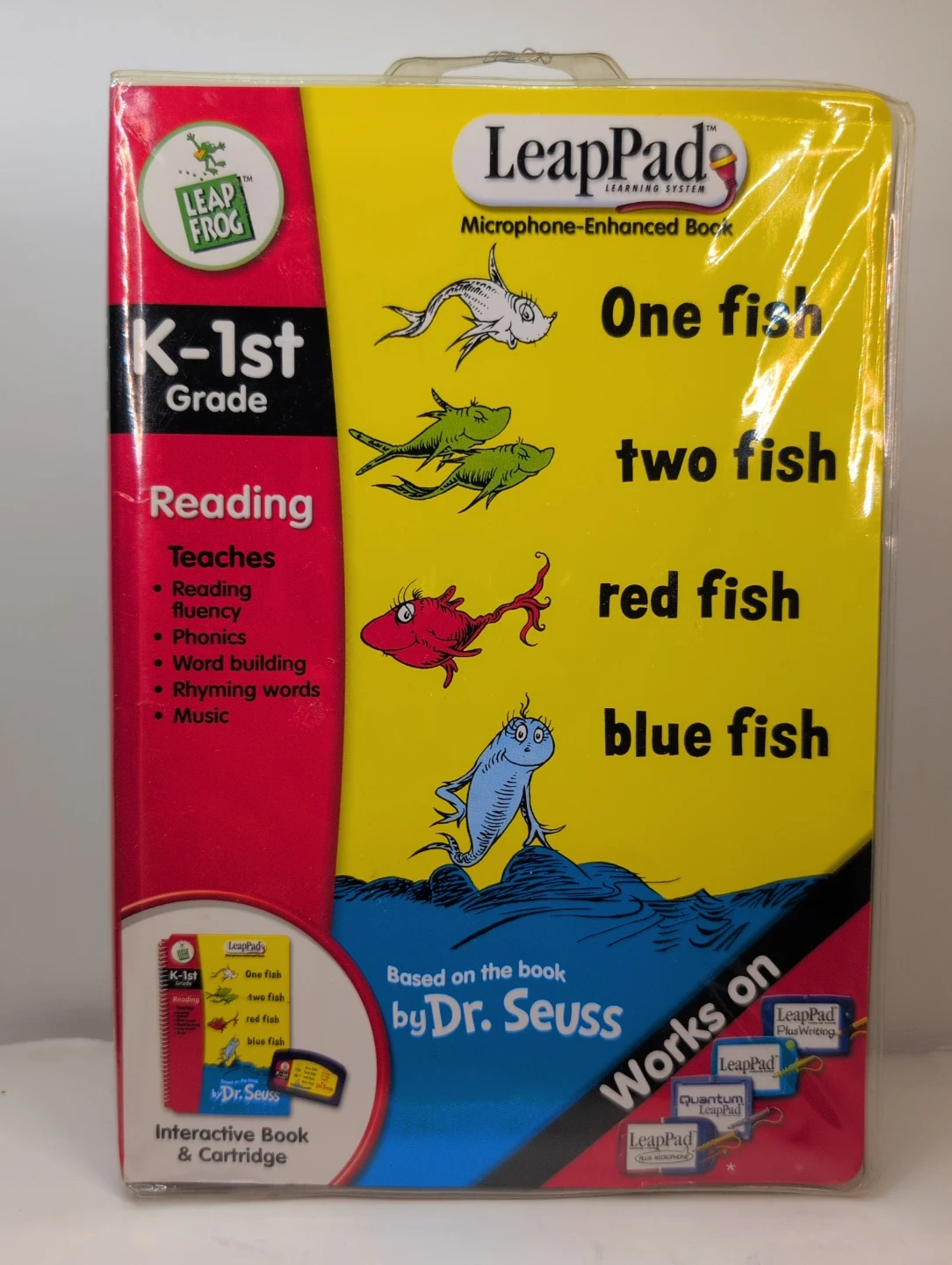 This LeapFrog LeapPad interactive book and cartridge is based on the Dr. Seuss classic "One Fish Two Fish Red Fish Blue Fish." It teaches reading fluency, phonics, word building, rhyming words, and music. Includes microphone activities for interactive learning. Works on LeapPad Plus Microphone and LeapPad Plus Writing systems. 2004 copyright.