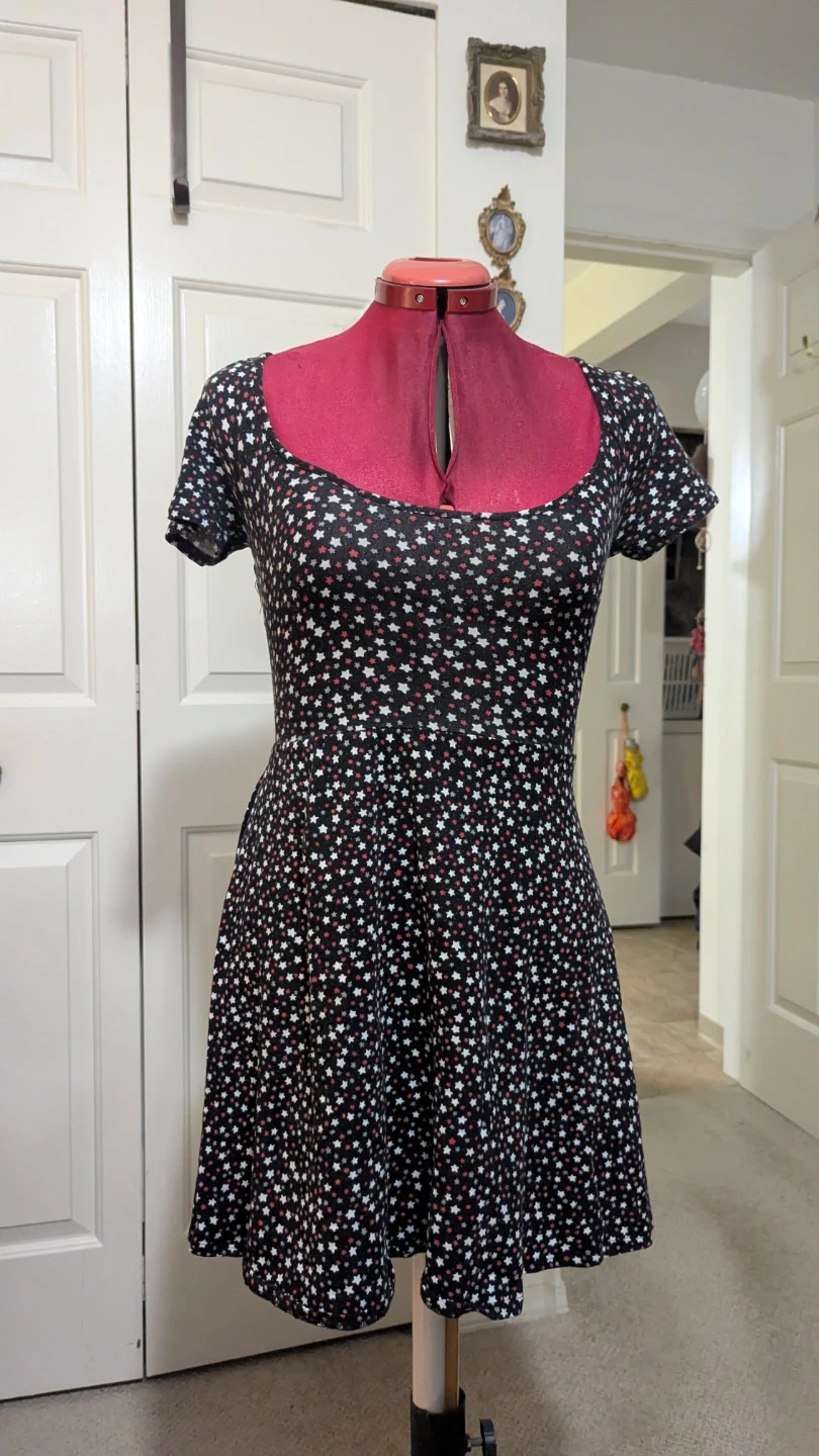 Cute mini dress with a star and floral print! It has a unique twist detail on the back with a small cutout. Perfect for summer or a night out.