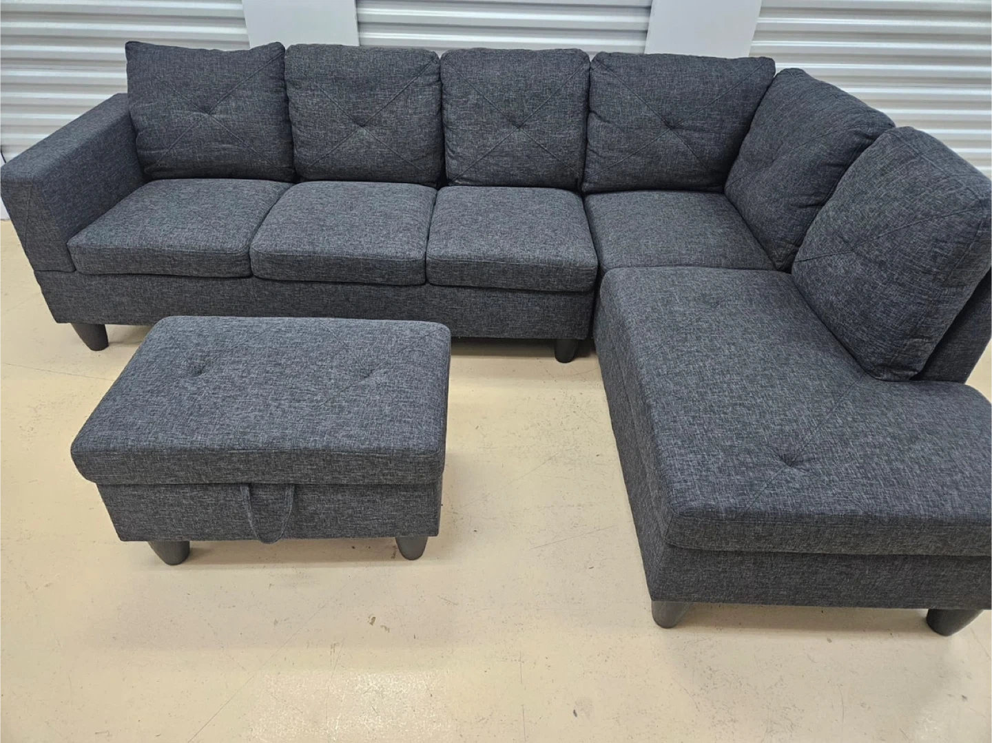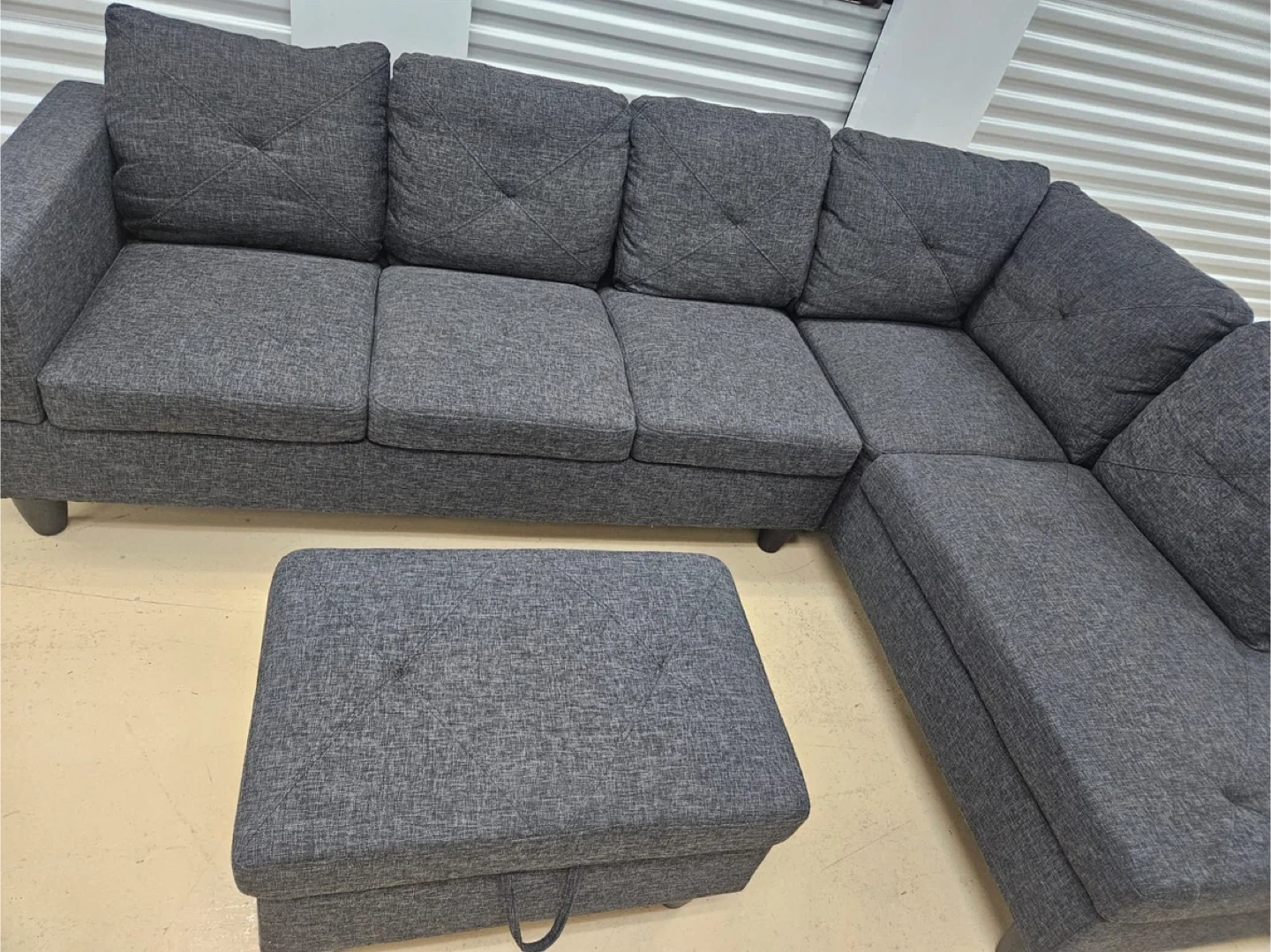Selling a comfy gray sectional sofa that comes with a matching ottoman! The dimensions are 104 inches by 75 inches, and it's 32 inches tall. Perfect for a living room or entertainment space, and the ottoman provides extra storage