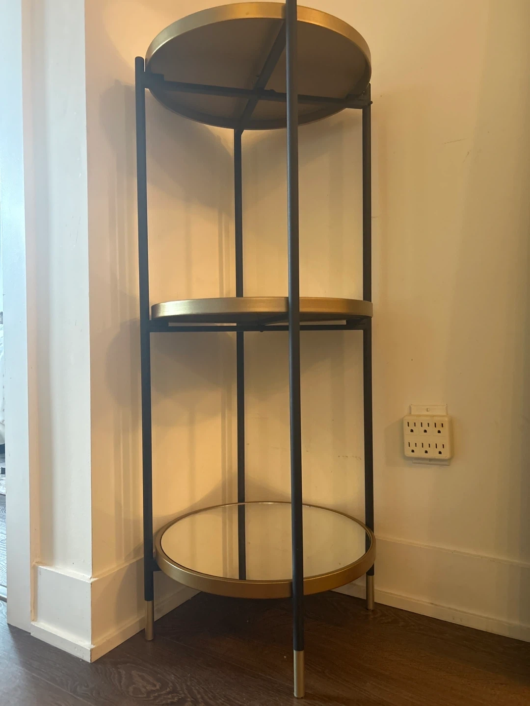 Selling a round 3-tier mirrored accent table with a gold and black finish. It's a stylish piece perfect for adding a touch of elegance to any room. From structube, retail $289