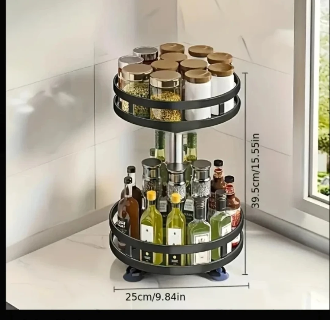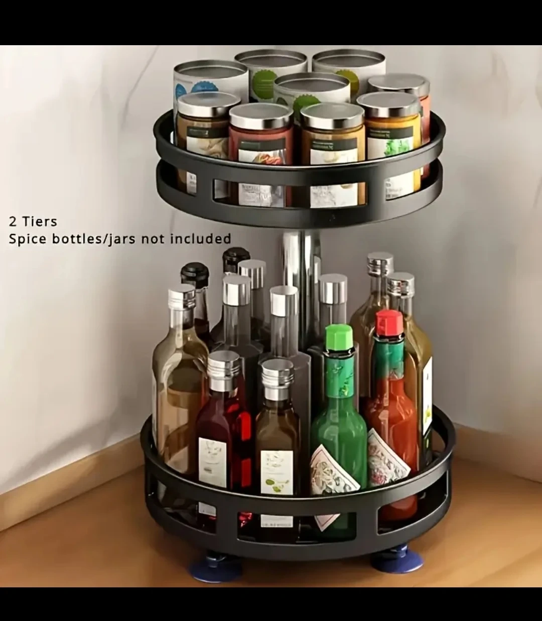 Keep your spices and bottles organized with this 360° rotatable seasoning shelf! It features two tiers and is perfect for seasoning bottles, beverage bottles, canned food, fruits, and snacks. Spice bottles/jars are not included.