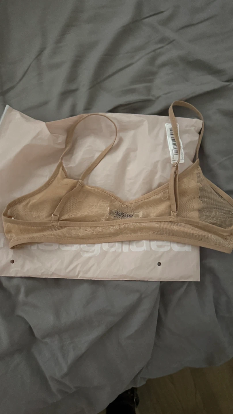 Selling a Missguided bralette in a pretty beige lace pattern! It comes with its original packaging. Fits size small.