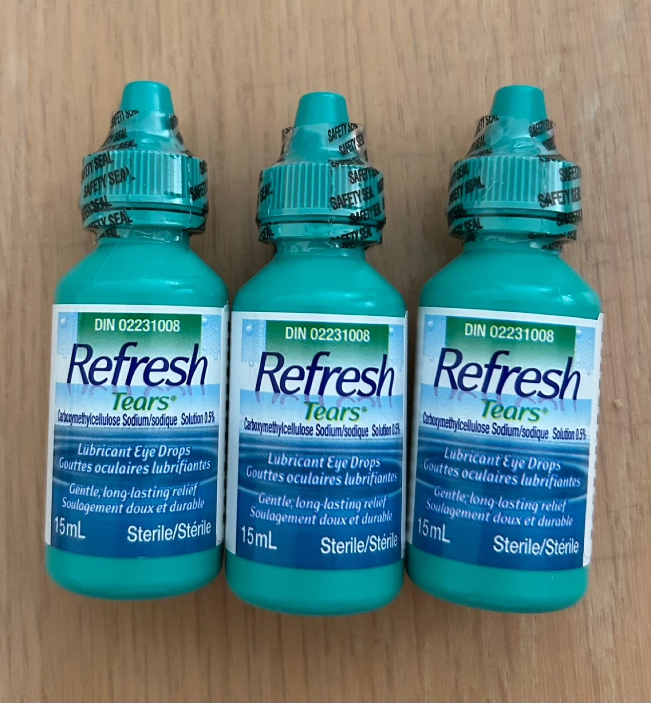 Selling three bottles of Refresh Tears lubricant eye drops! Each bottle contains 15mL of solution. They provide gentle, long-lasting relief for dry, irritated eyes.