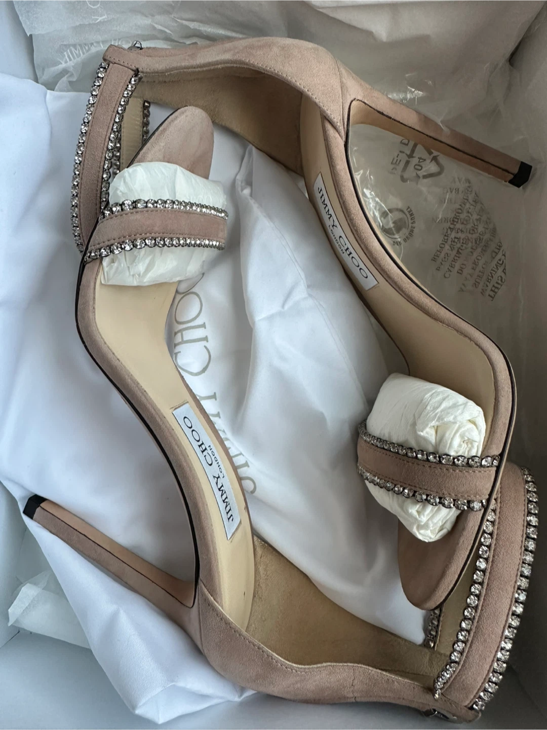 Selling a pair of beautiful Jimmy Choo DOCHAS 100 in ballet pink. They are a light tan or nude colour and feature sparkly embellishments. It comes with the original box and 2 dust bags for each shoe.