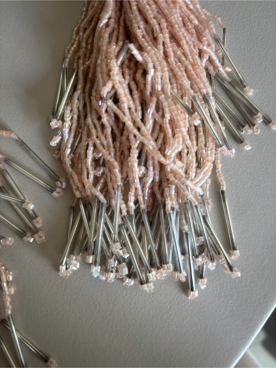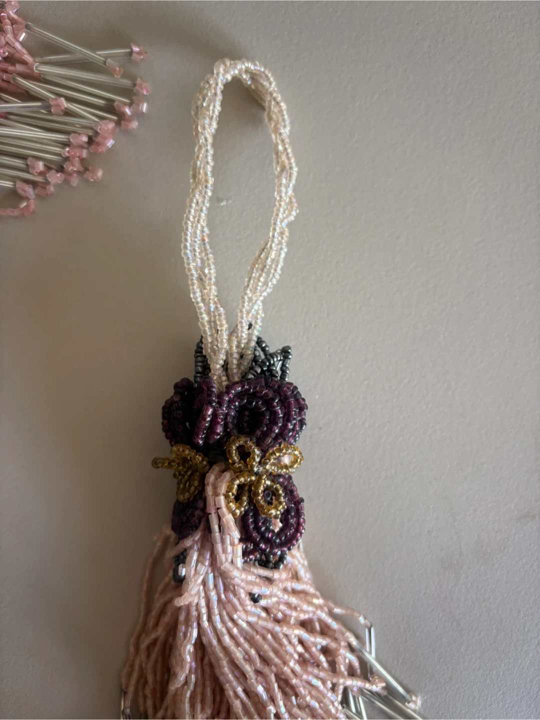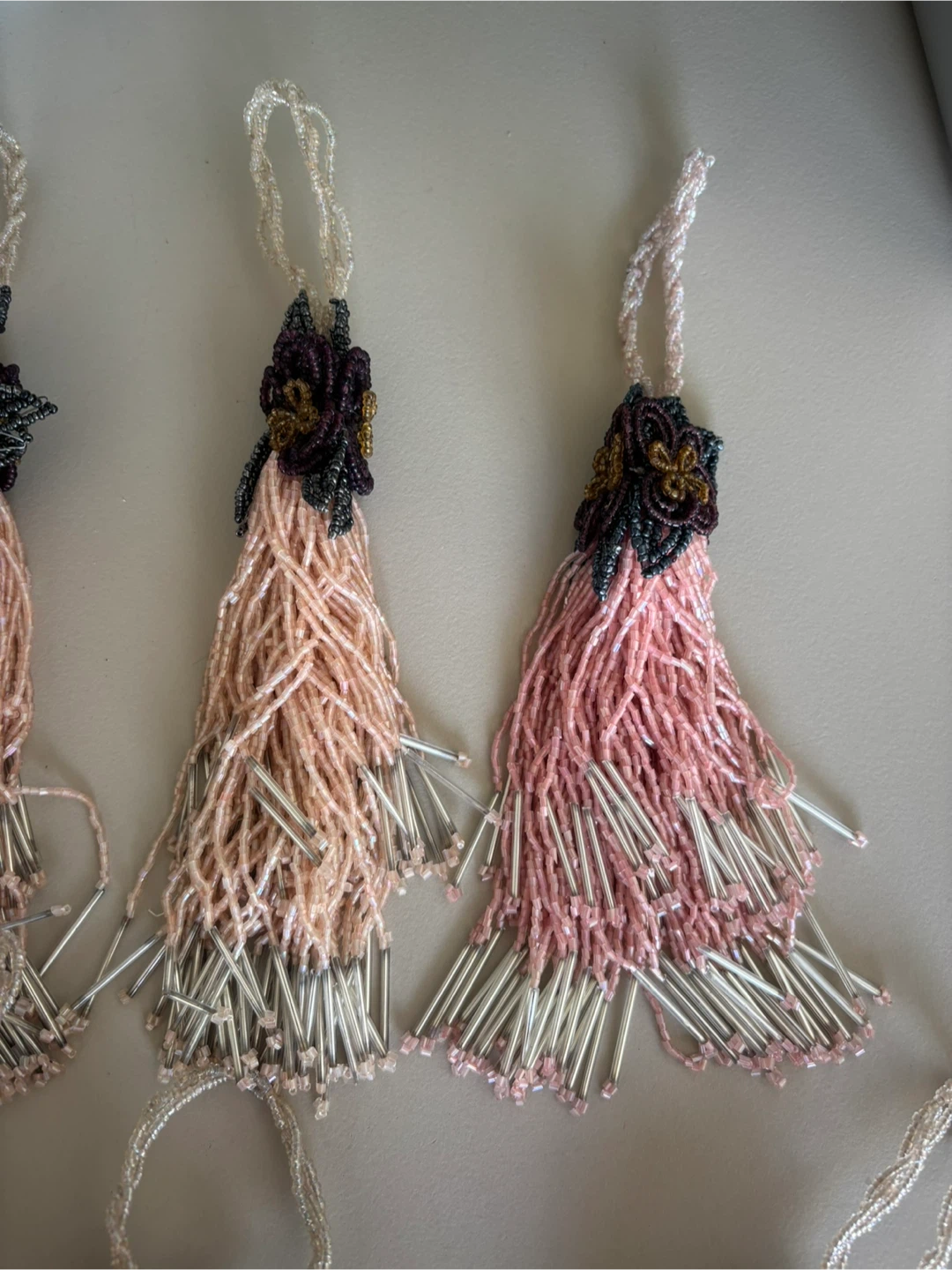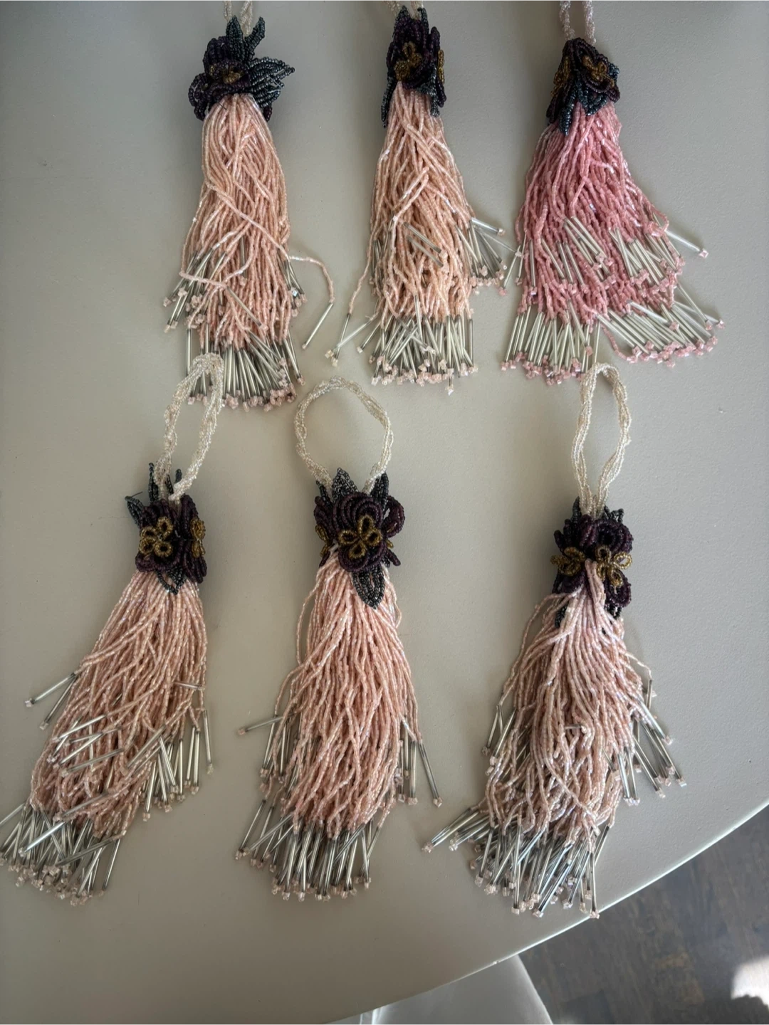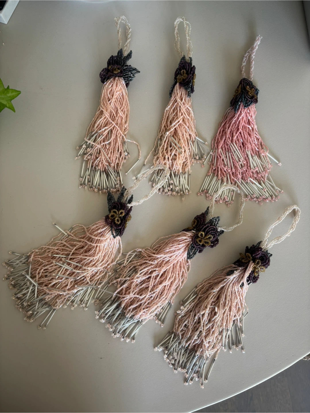 Selling a set of six handmade beaded tassels. They feature a delicate flower design at the top with pink and silver beads forming the tassel. They're in great condition and would add a lovely touch to any craft project or decorative piece