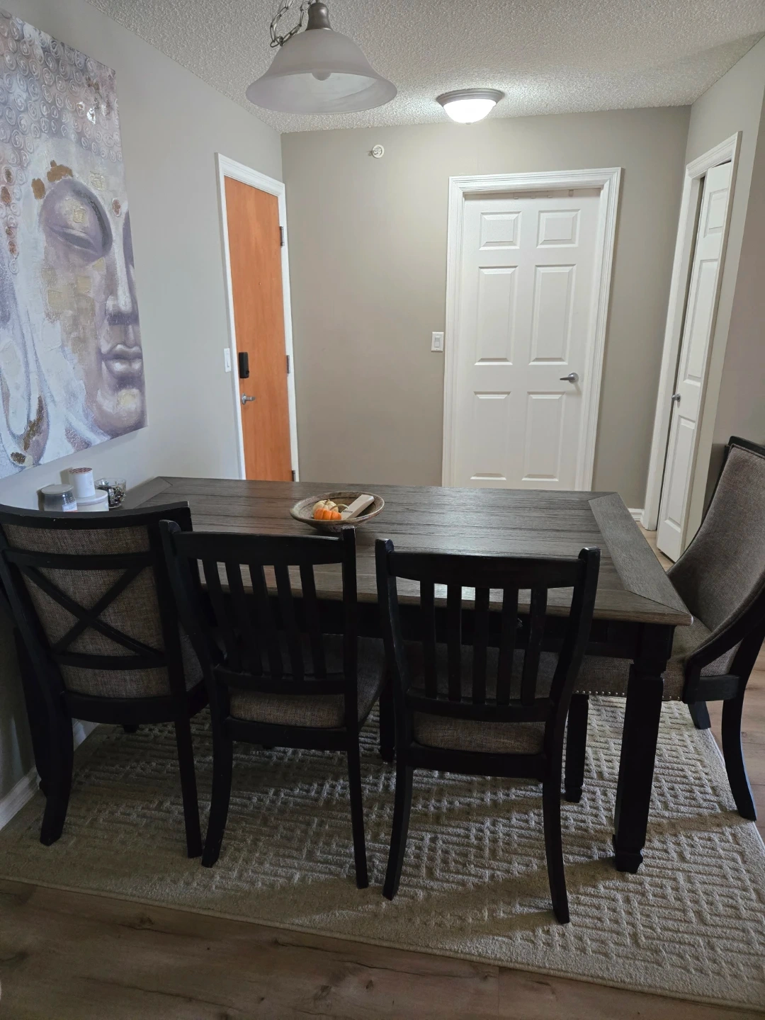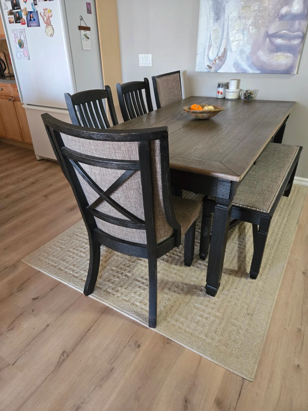 Selling an Urban Barn dining table set that includes four chairs and a bench. The set features a dark wood finish and neutral-toned upholstery on the chairs and bench. It's perfect for a family dining space or a cozy kitchen nook!
