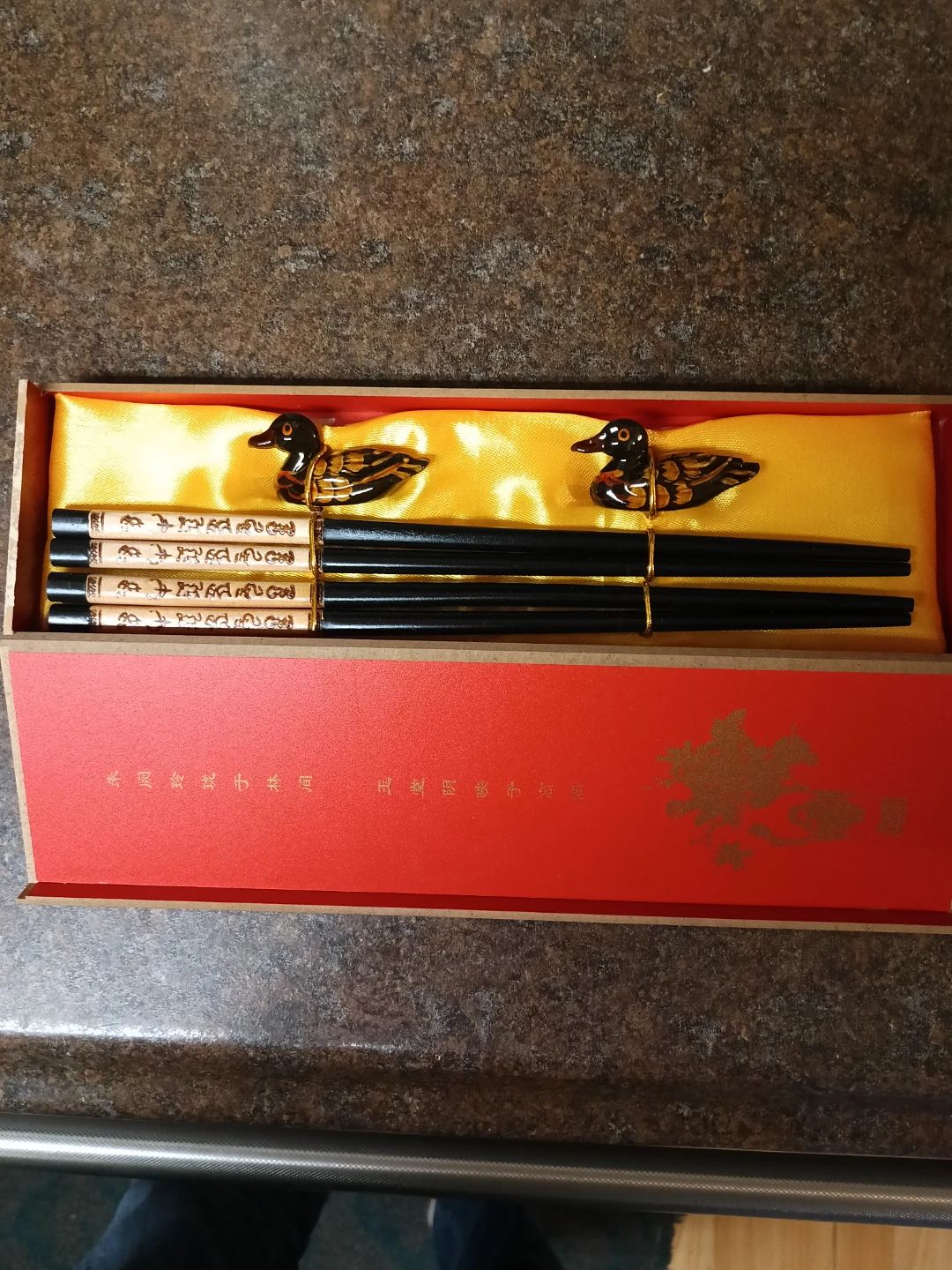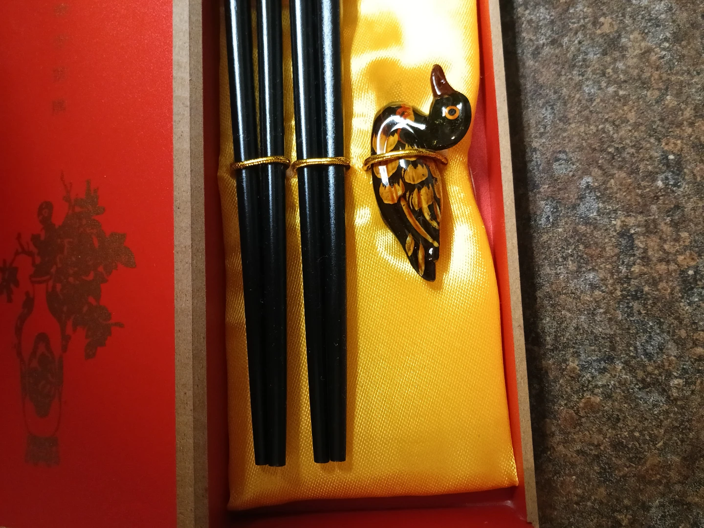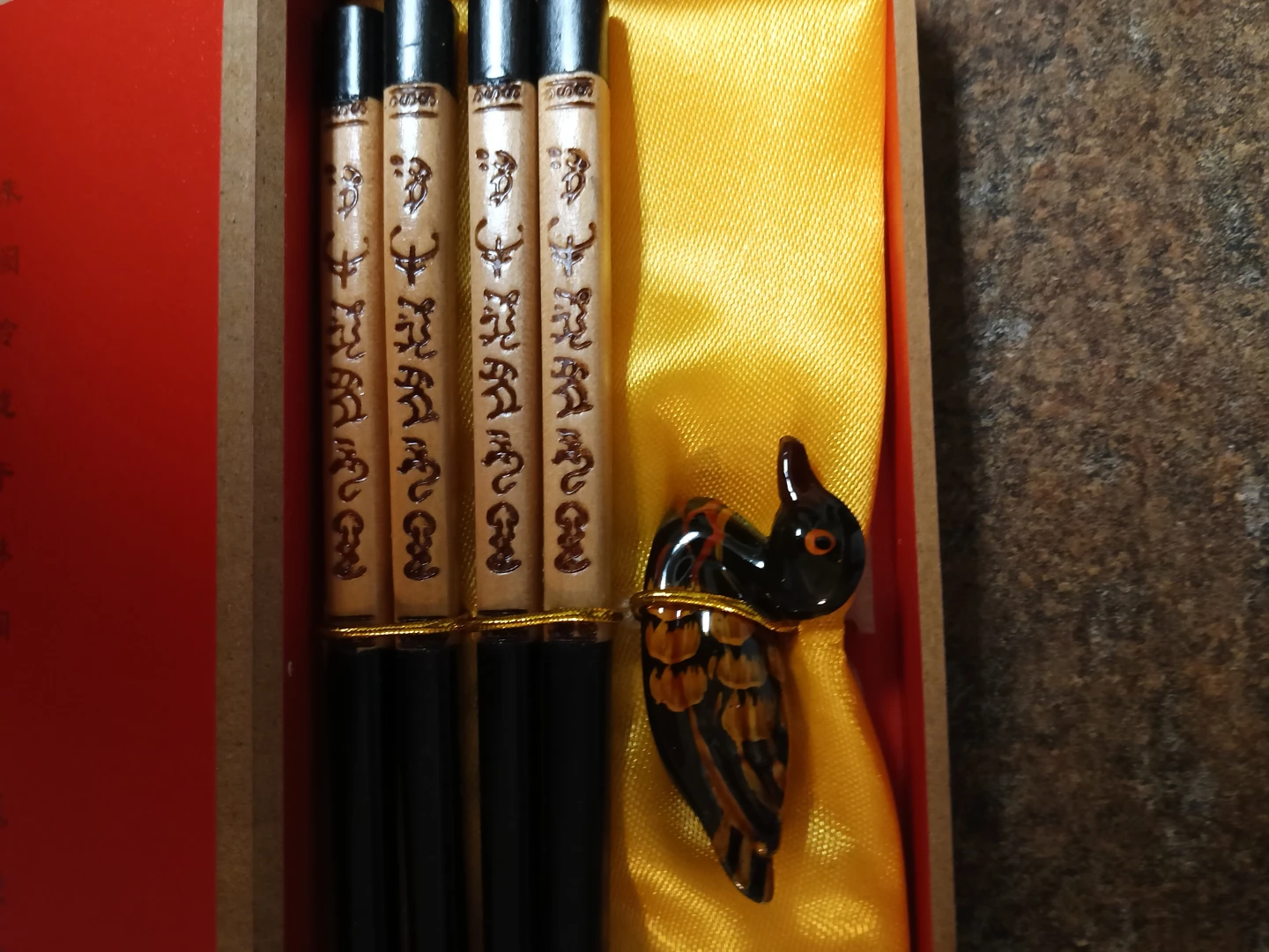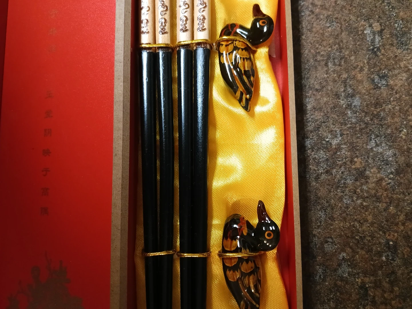 Here's a lovely chopstick set in a red box! It includes four pairs of chopsticks and two duck holders. Perfect for adding a touch of elegance to your dining experience