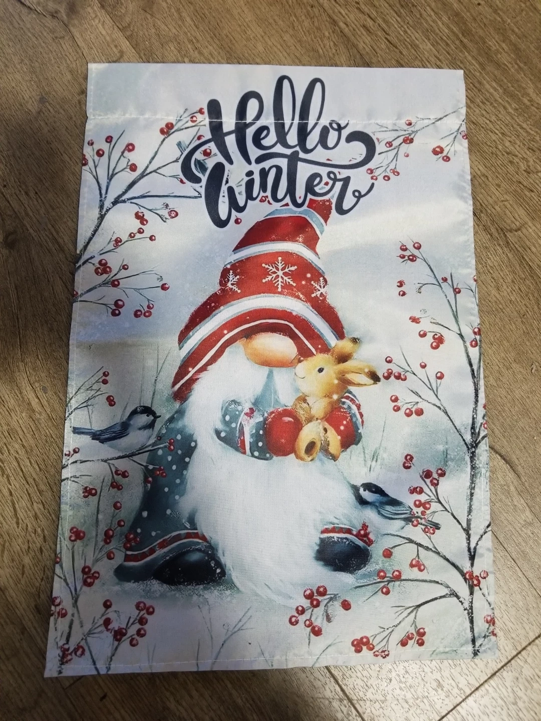 240This is a cute garden flag with a gnome holding a bunny in a winter scene. It says "Hello Winter" in cursive lettering. Perfect for adding a touch of whimsy to your outdoor decor this season 18x12