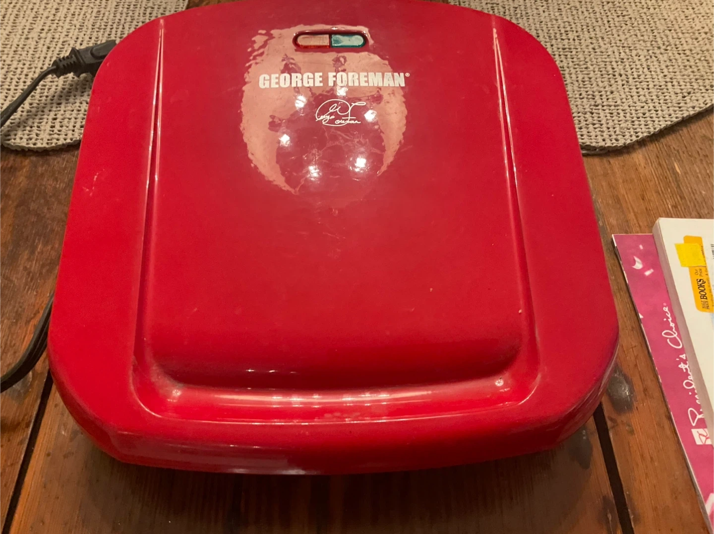 Selling a used George Foreman grill in red. It's in good working condition and perfect for quick and healthy meals!