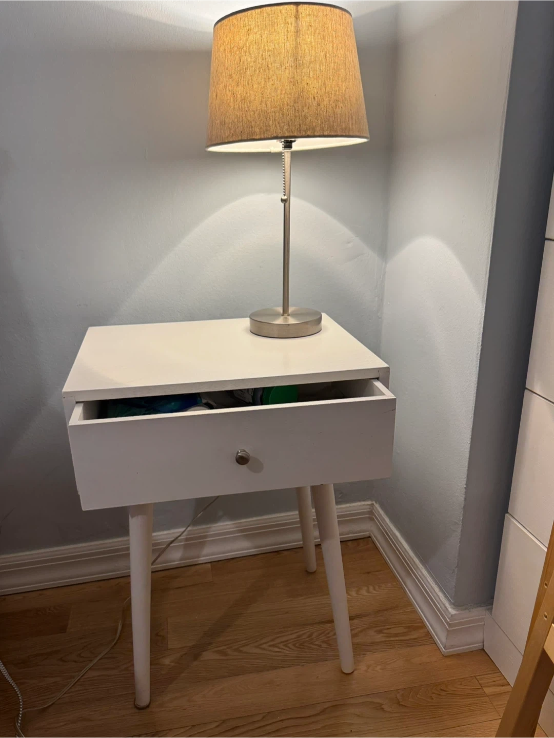 Selling a cute white nightstand! Mid Century style. It has a drawer for storage and a clean, simple design. Perfect for adding a touch of modern style to your bedroom.