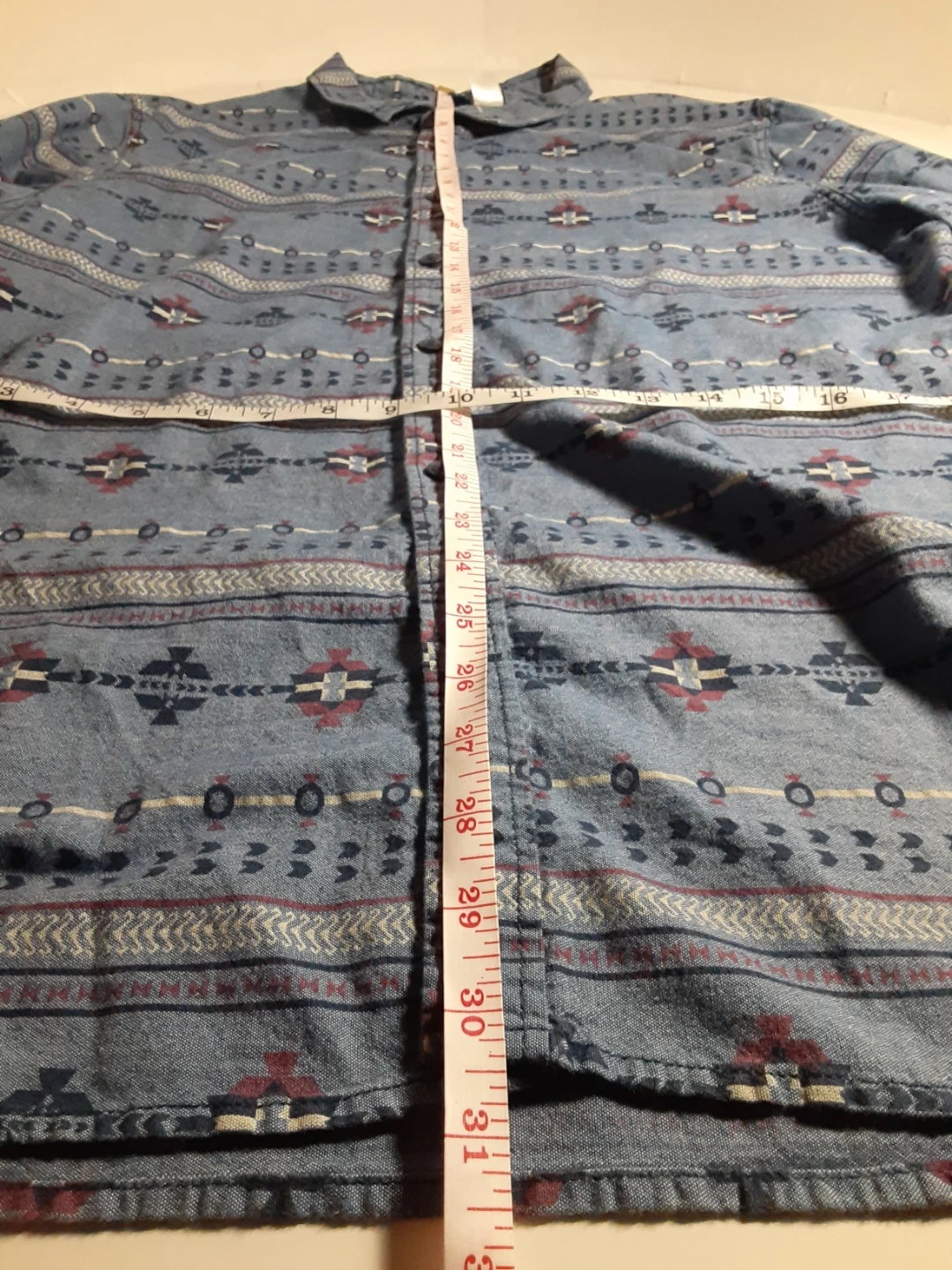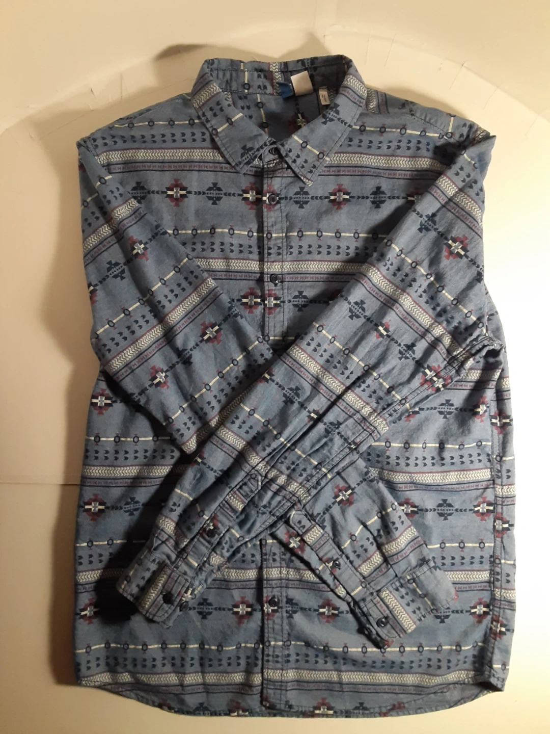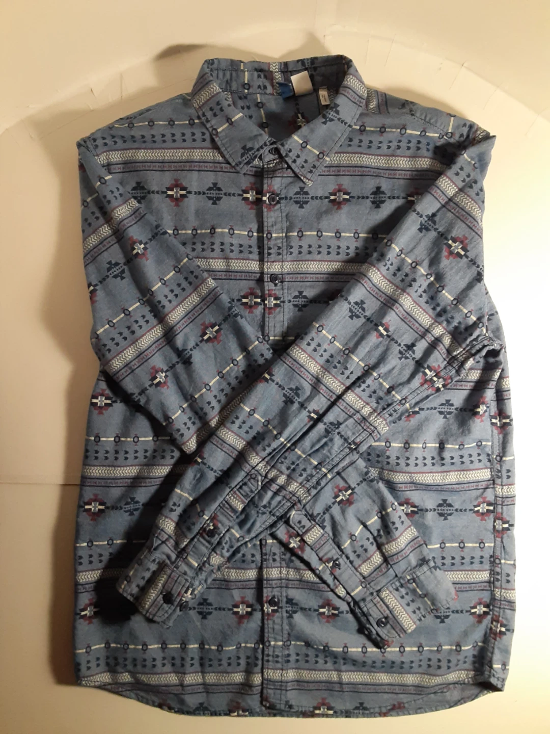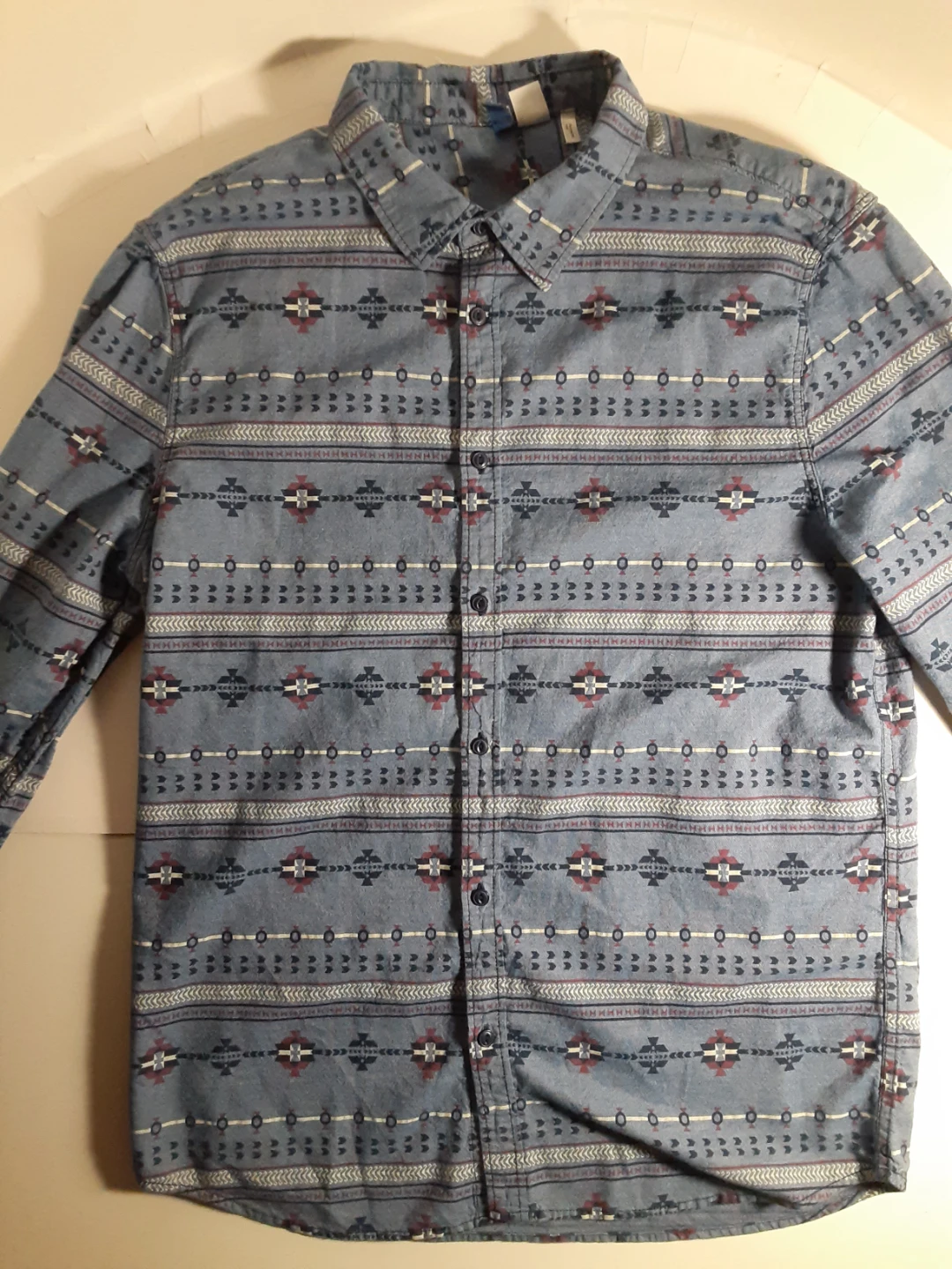 H&M Divided - large(see images for measurements), long sleeve, blue, western patterned button up shirt. Gently used, 100% cotton and in excellent condition.