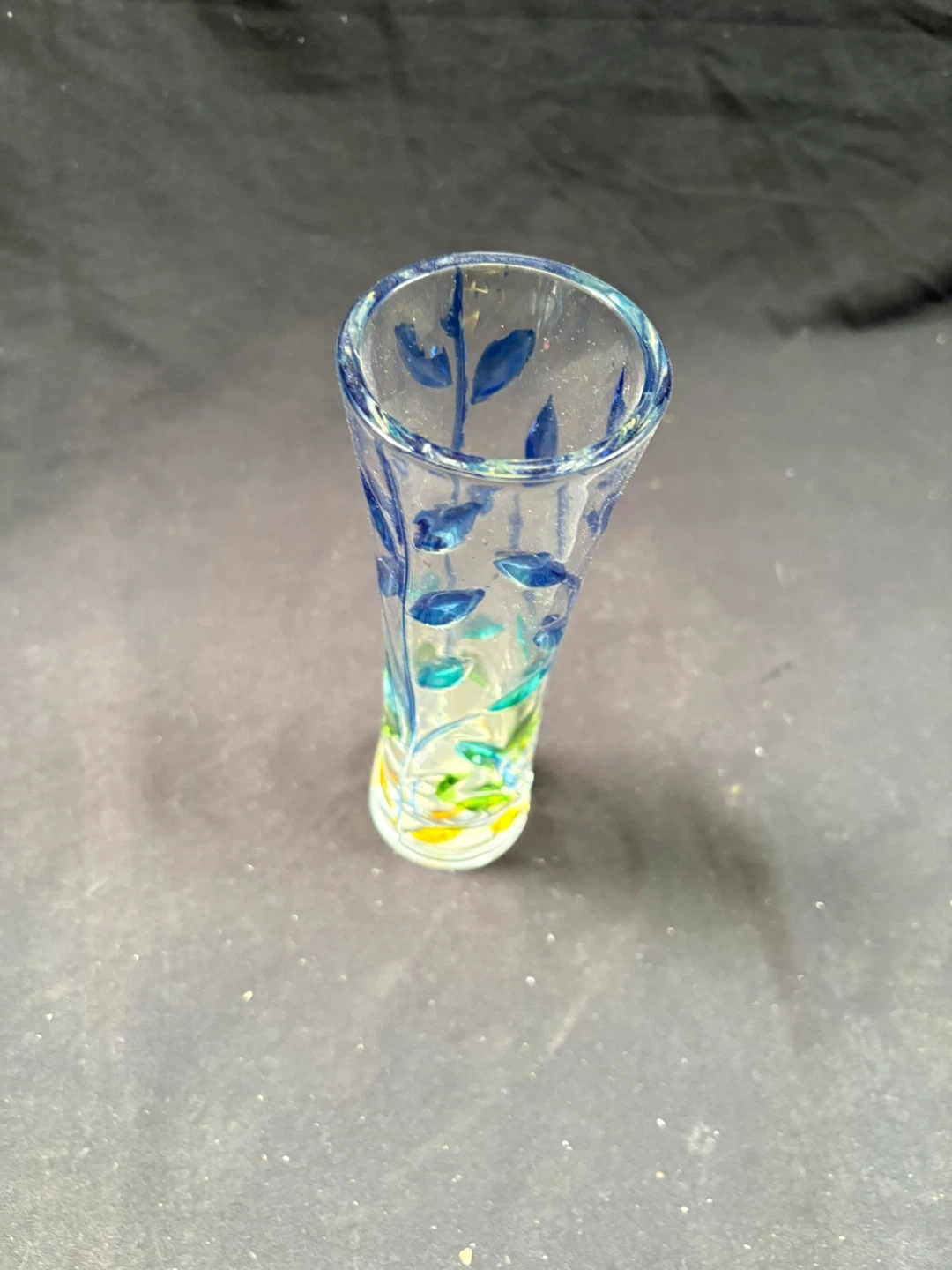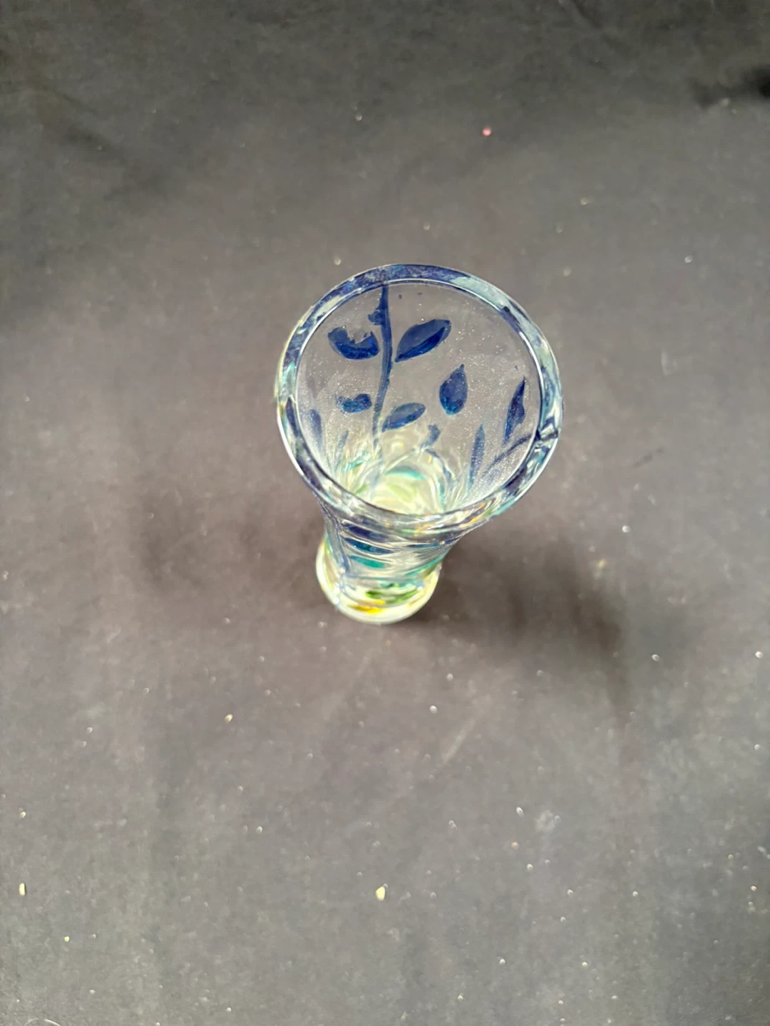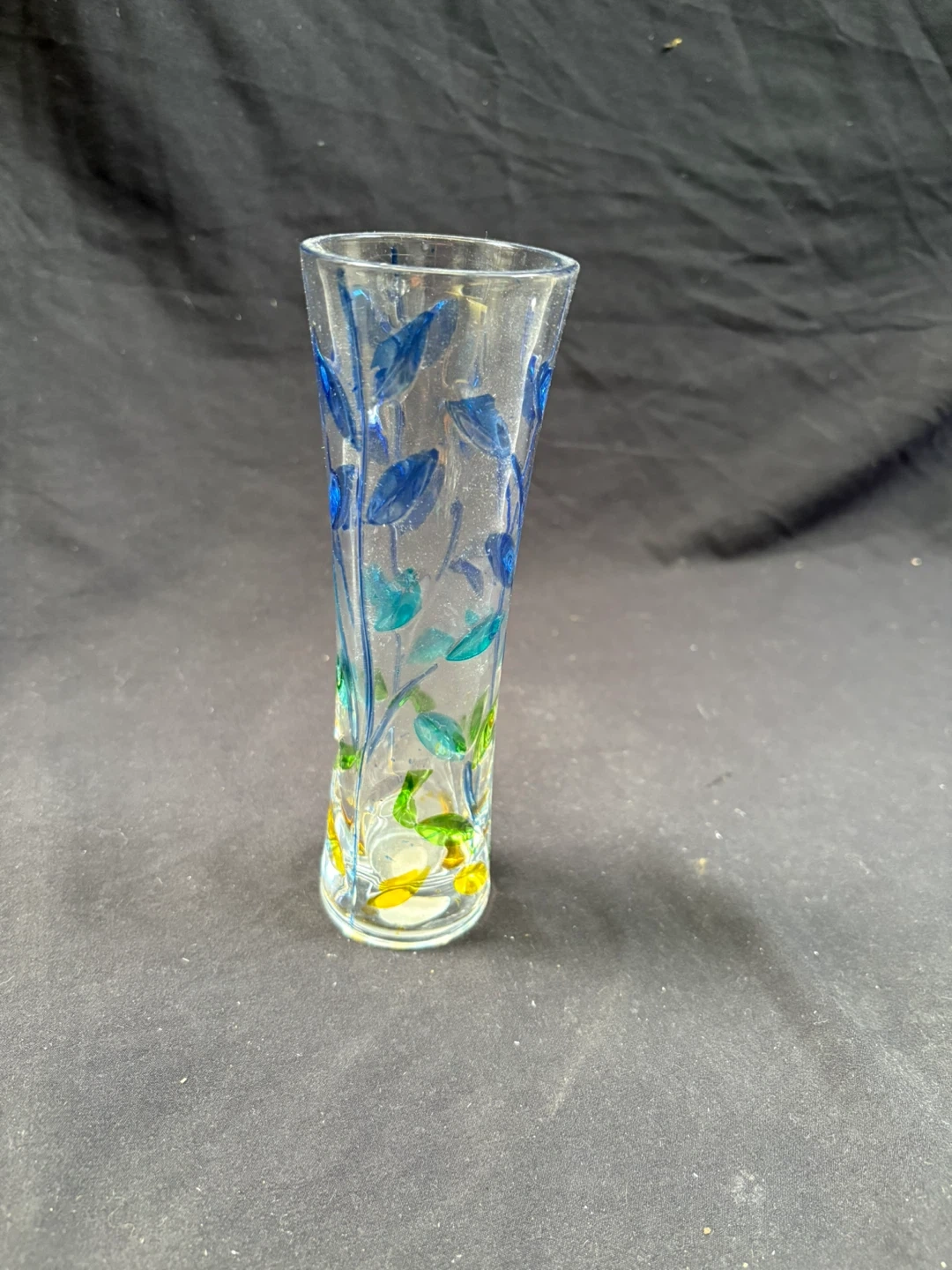 A beautiful clear glass vase with a lovely blue, green, and yellow floral design. It's in great condition and would look lovely with a small bouquet of flowers!