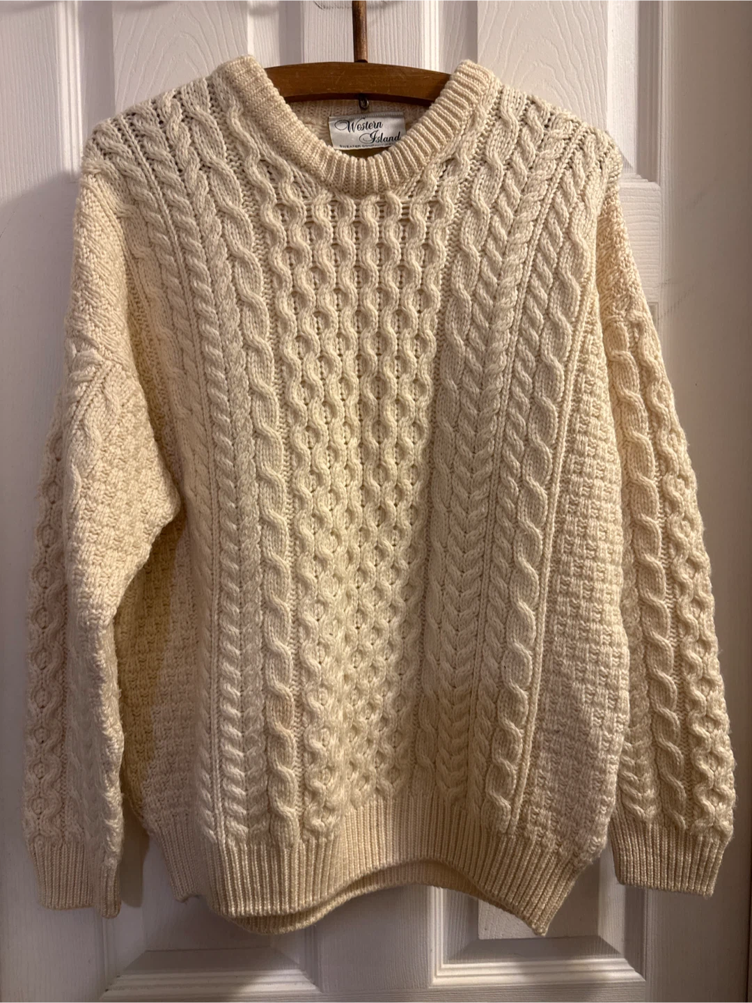 Selling a cozy cream-coloured cable knit sweater from Western Island Sweater Company Ireland! It's in great condition and perfect for staying warm on chilly days. 100% Marino wool