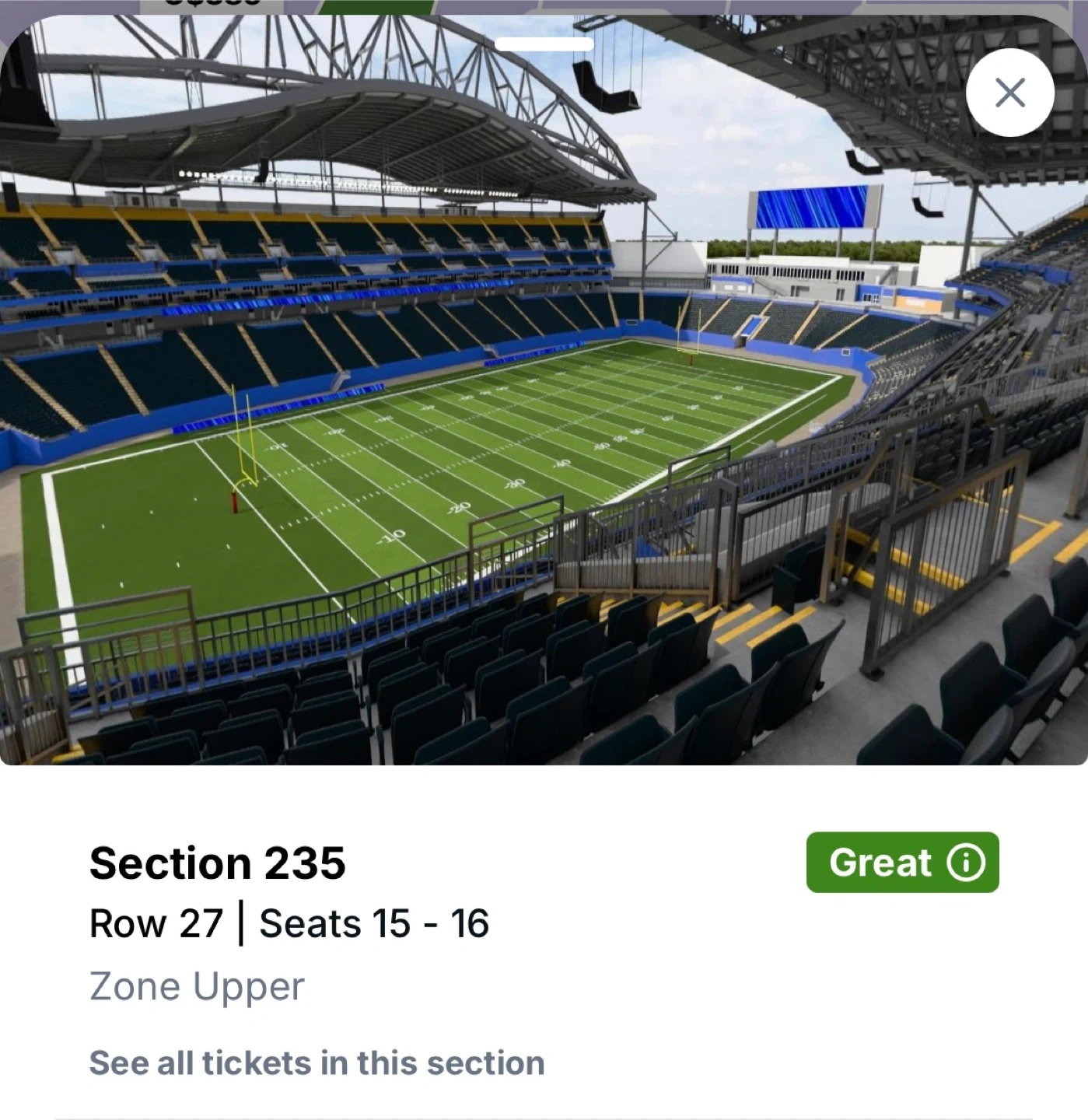 Buy & Sell2025 Grey Cup Ticleats2025 Grey Cup Ticleats$260Selling tickets for the November 16th, 2025 Grey Cup Game in Winnipeg. These are located in Section 235, Row 27, Seats 15 and 16. $260 each or $520 for both.ConditionNew0 chats·0 favorites·10 viewsSELLERBrianneMission Gardens21922 reviewsWHERE TO MEETMission Gardens
