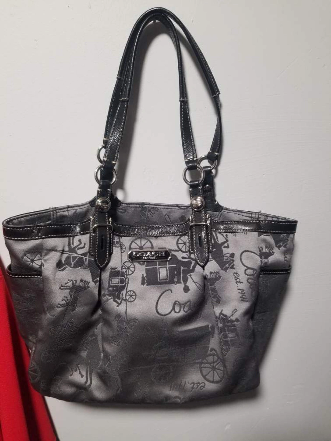 89Selling a Coach tote bag with the Est. 1941 logo. It features a unique pattern and is in great condition. The model number is L1068-F15553. Gently used