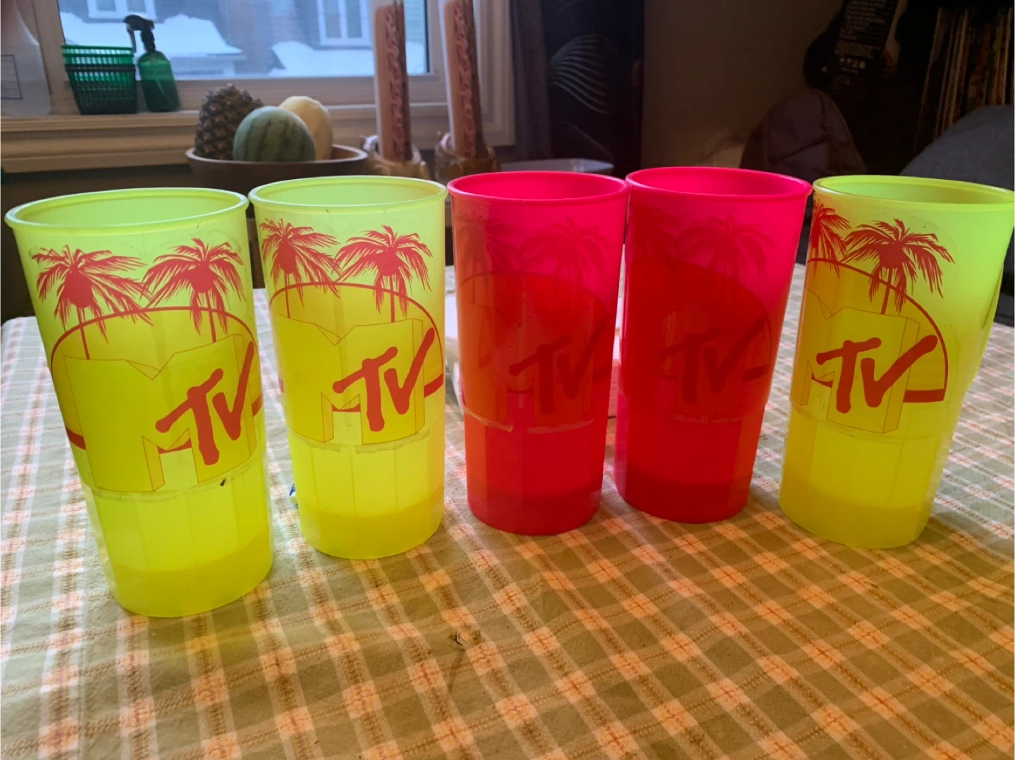 #gifting a set of 5 vibrant MTV cups featuring a cool palm tree design! There are 3 yellow and 2 red cups. Perfect for adding a retro touch to your kitchen or collection…. Movie Set Prop from Salt N Pepa!
