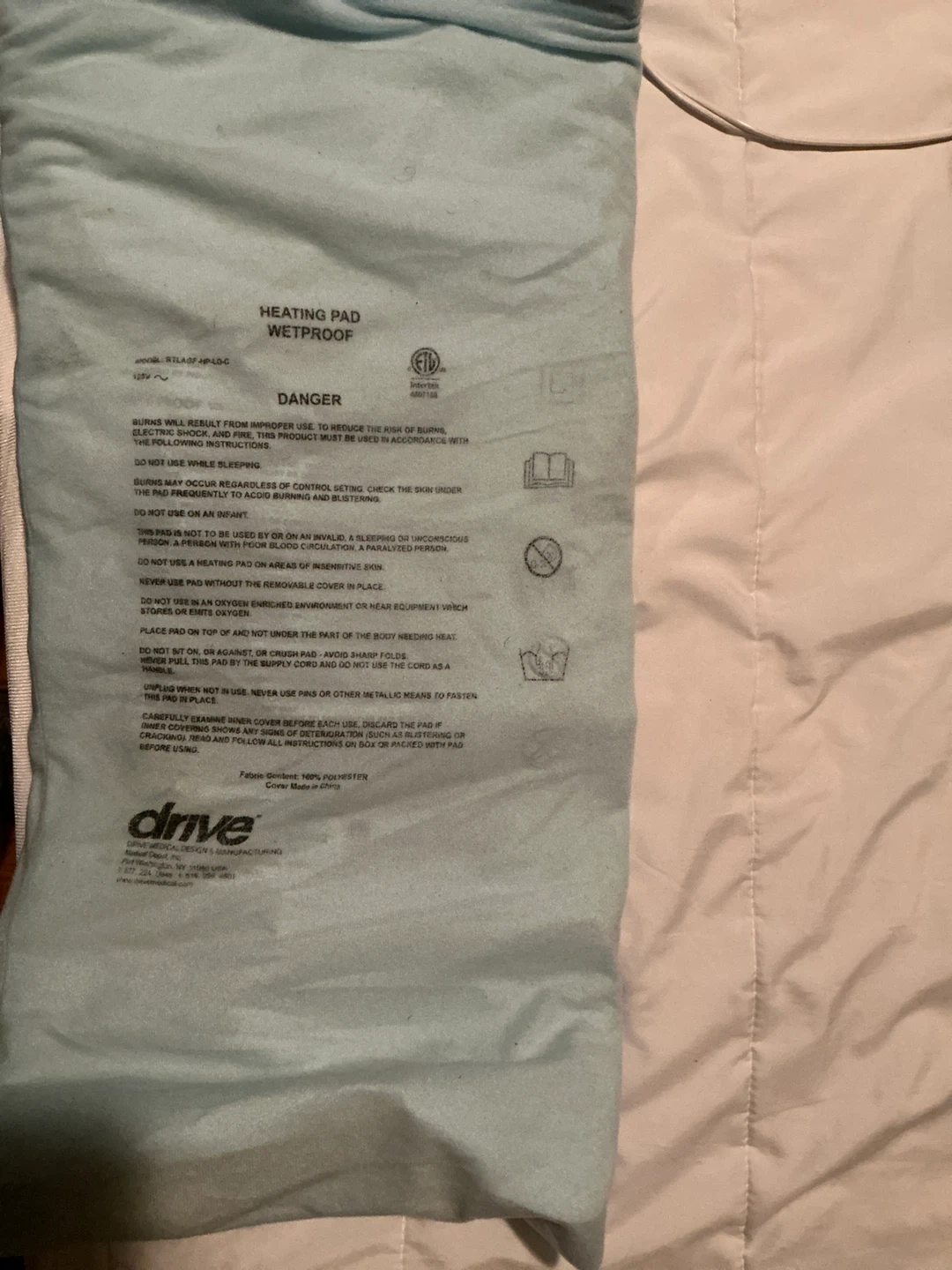 Selling a Drive waterproof heating pad. It's made with 100% polyester fabric. Please read all safety instructions before using