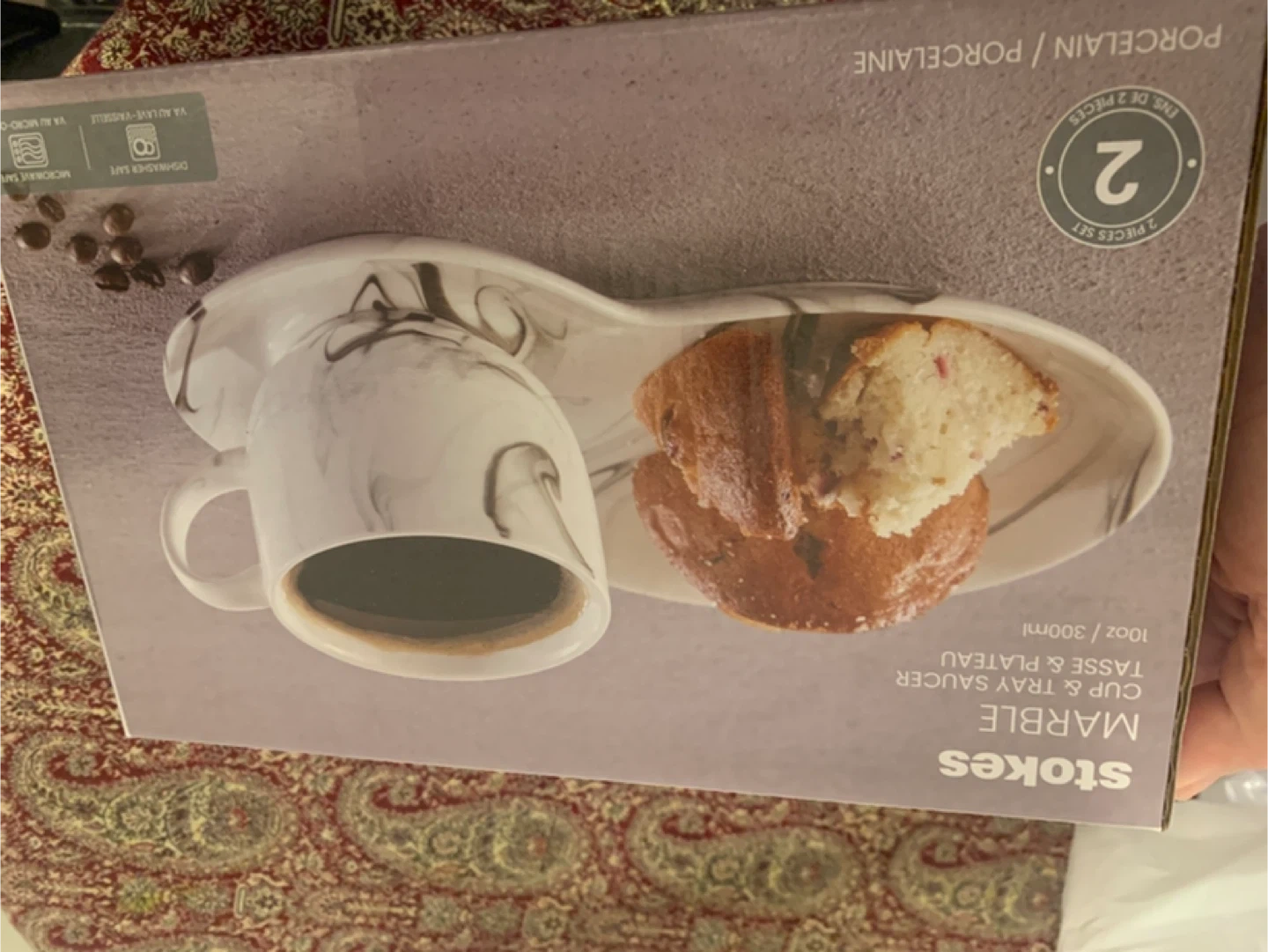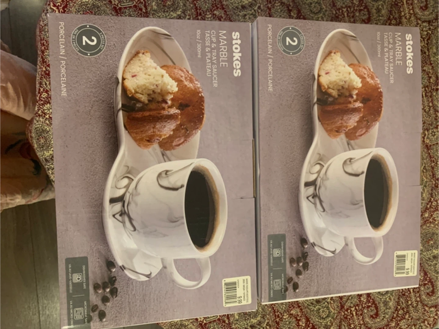 133Each set $10 Selling two Stokes Marble Cup & Tray Saucer sets! Each set contains 2 pieces and is made of porcelain. The cup holds 10oz / 300ml. They are dishwasher and microwave safe! Brand new in box