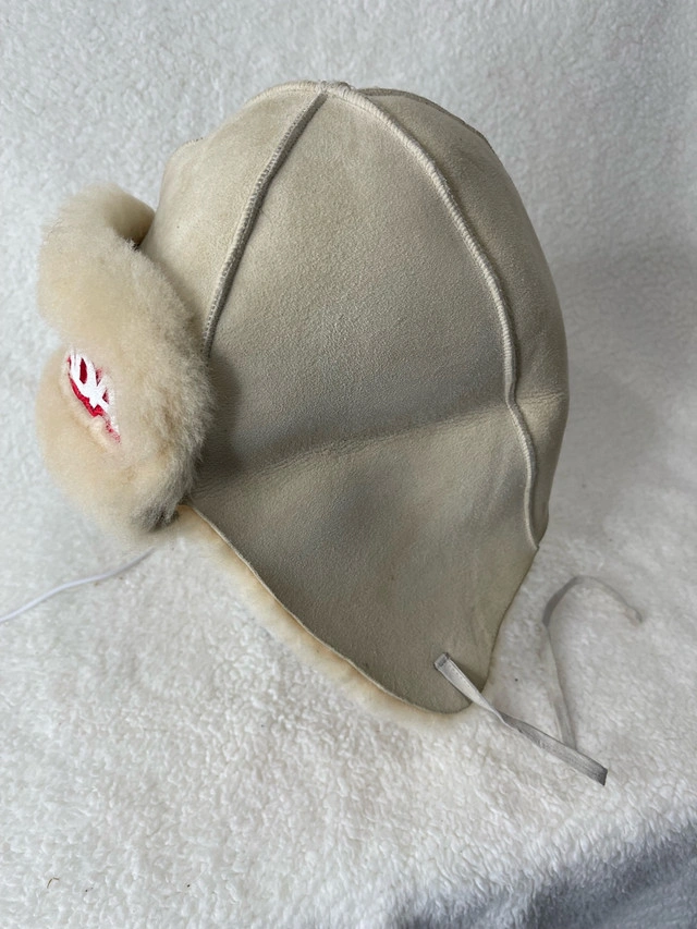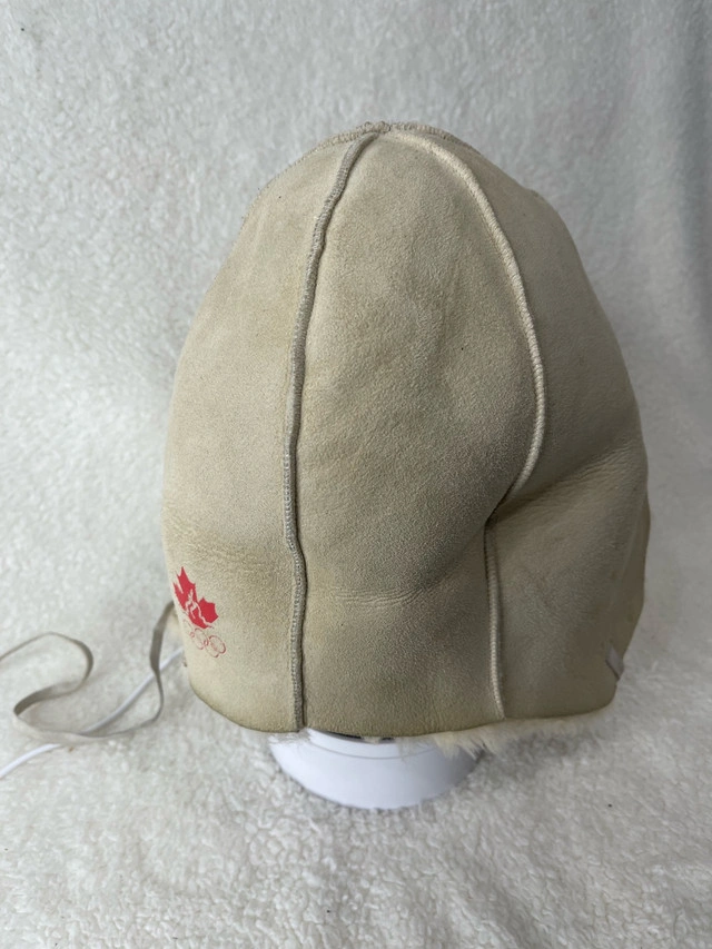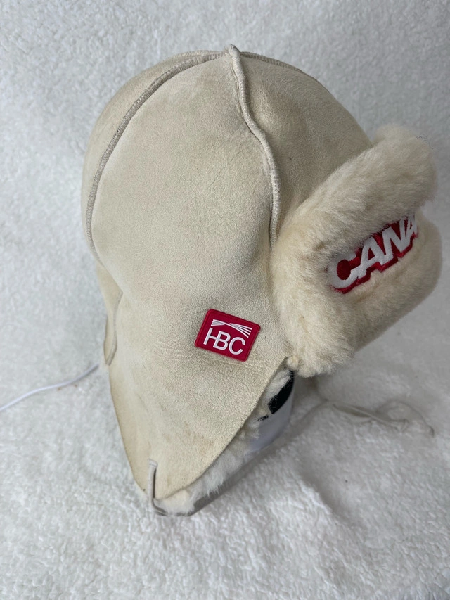 278Keep cozy this winter with this HBC Sheepskin Olympic Trapper Hat. Featuring a classic design with a Canadian Olympic logo, it's both stylish and functional. The sheepskin material provides excellent warmth and comfort during the colder months. It is in used condition and shows signs of wear. * Brand: HBC (Hudson's Bay Company) * Material: Genuine Sheepskin * Design: Olympic Edition * Colour: Beige / Natural * Size: One size fits most Looking to add a touch of Canadian pride to your winter wardrobe? Elbows up!