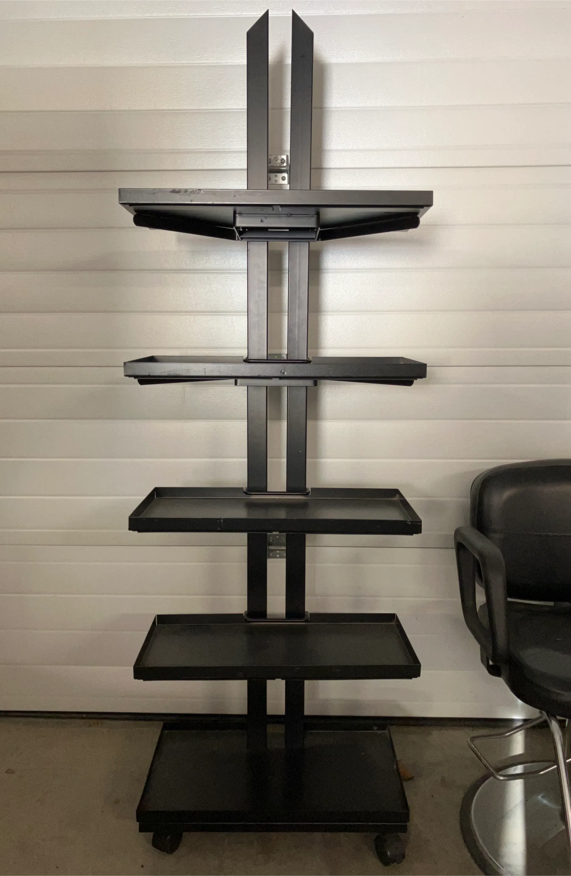 This is a rolling salon tray cart, perfect for organizing your tools and supplies. It's black and has multiple tiers for storage