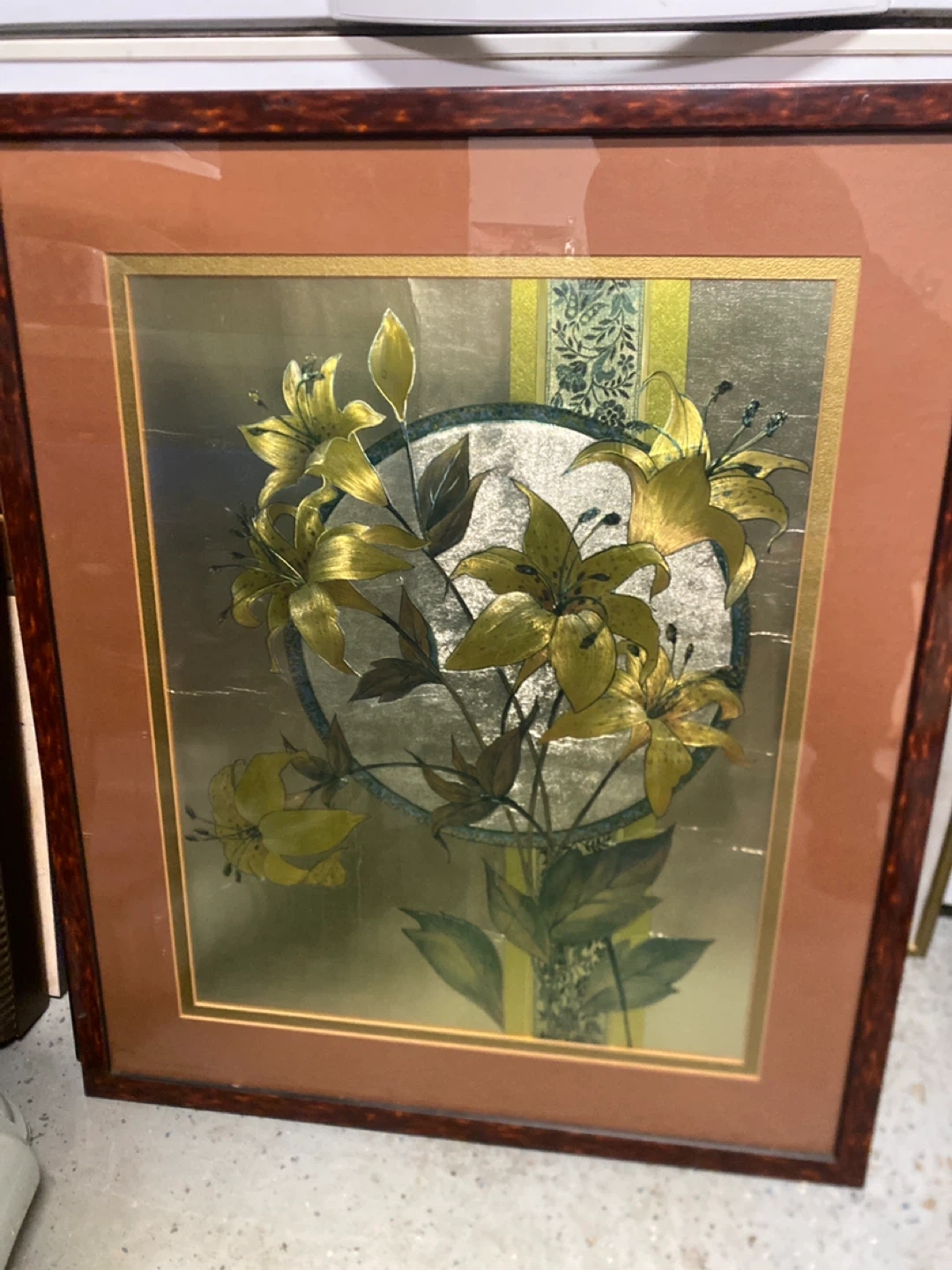 Selling a large beautiful framed gold foil piece of wall art featuring a floral print. It's in good condition and would be a lovely addition to any room!