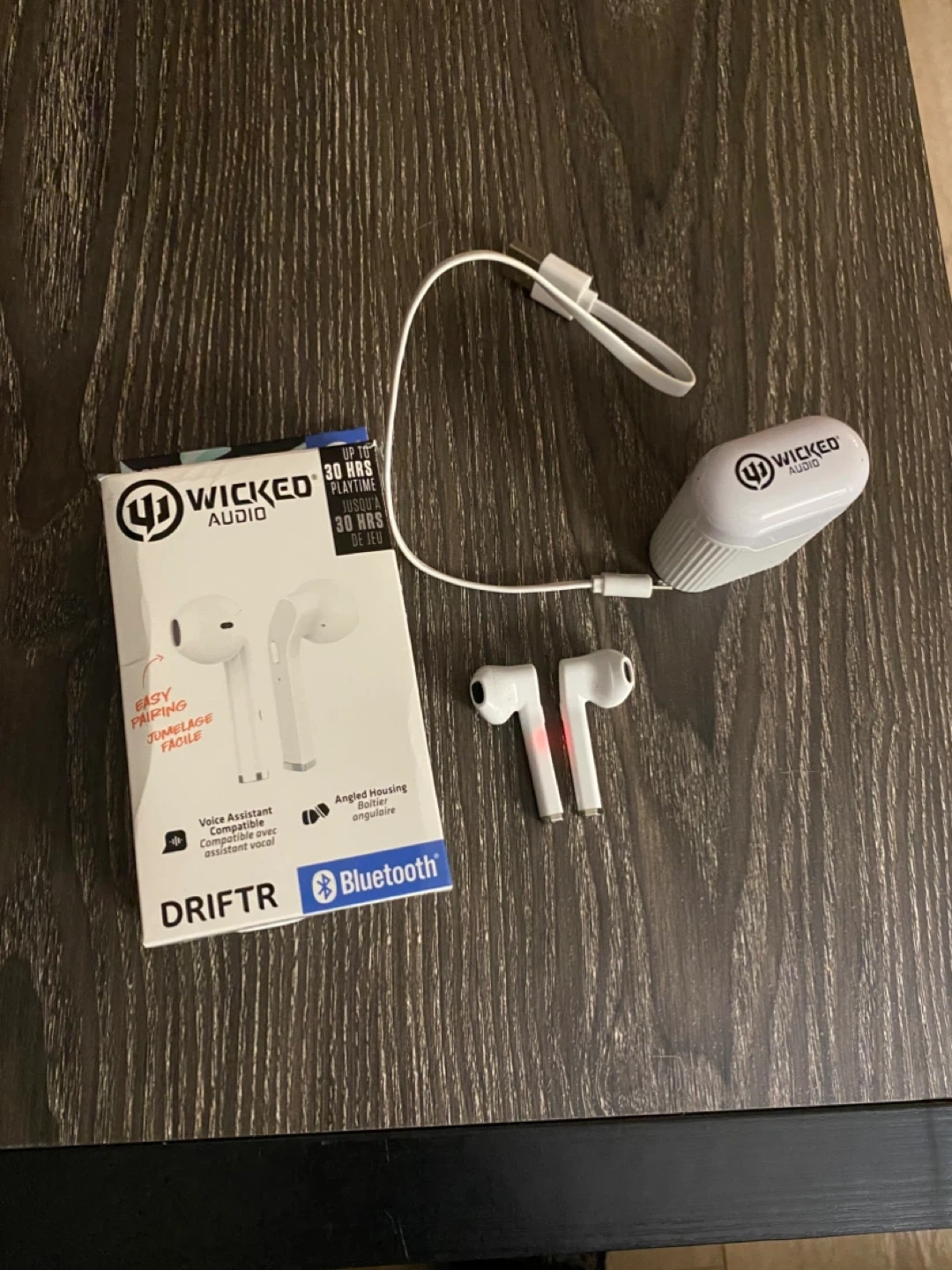 Selling a pair of Wicked Audio Driftr Bluetooth earbuds. They are in excellent condition and come with the original box! These earbuds feature easy pairing and are voice assistant compatible. Enjoy up to 30 hours of playtime. They also have an angled housing for a comfortable fit!