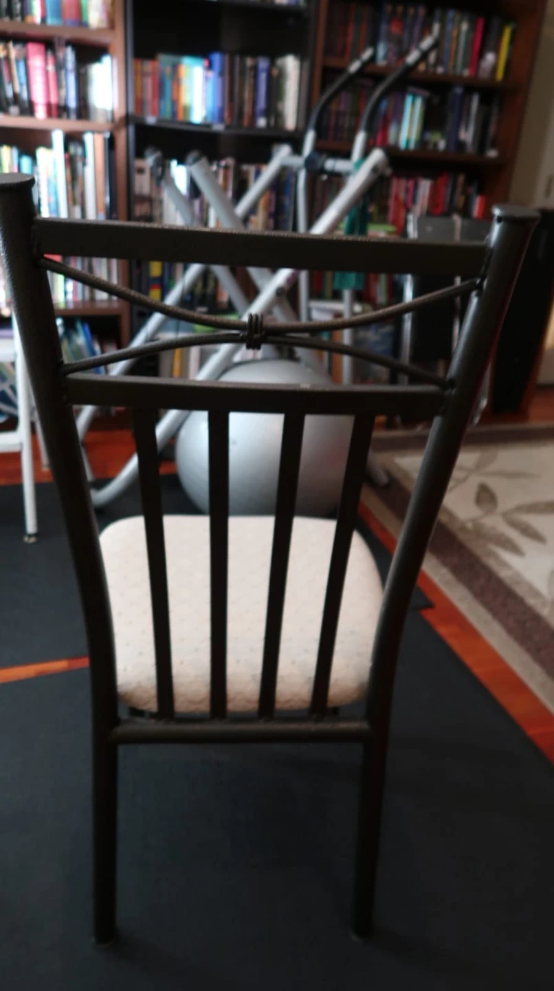 Selling a dining room chair with a black metal frame and a patterned fabric seat. It's in good condition and would be a nice addition to your dining area or kitchen. The chair is sturdy and comfortable for everyday use!