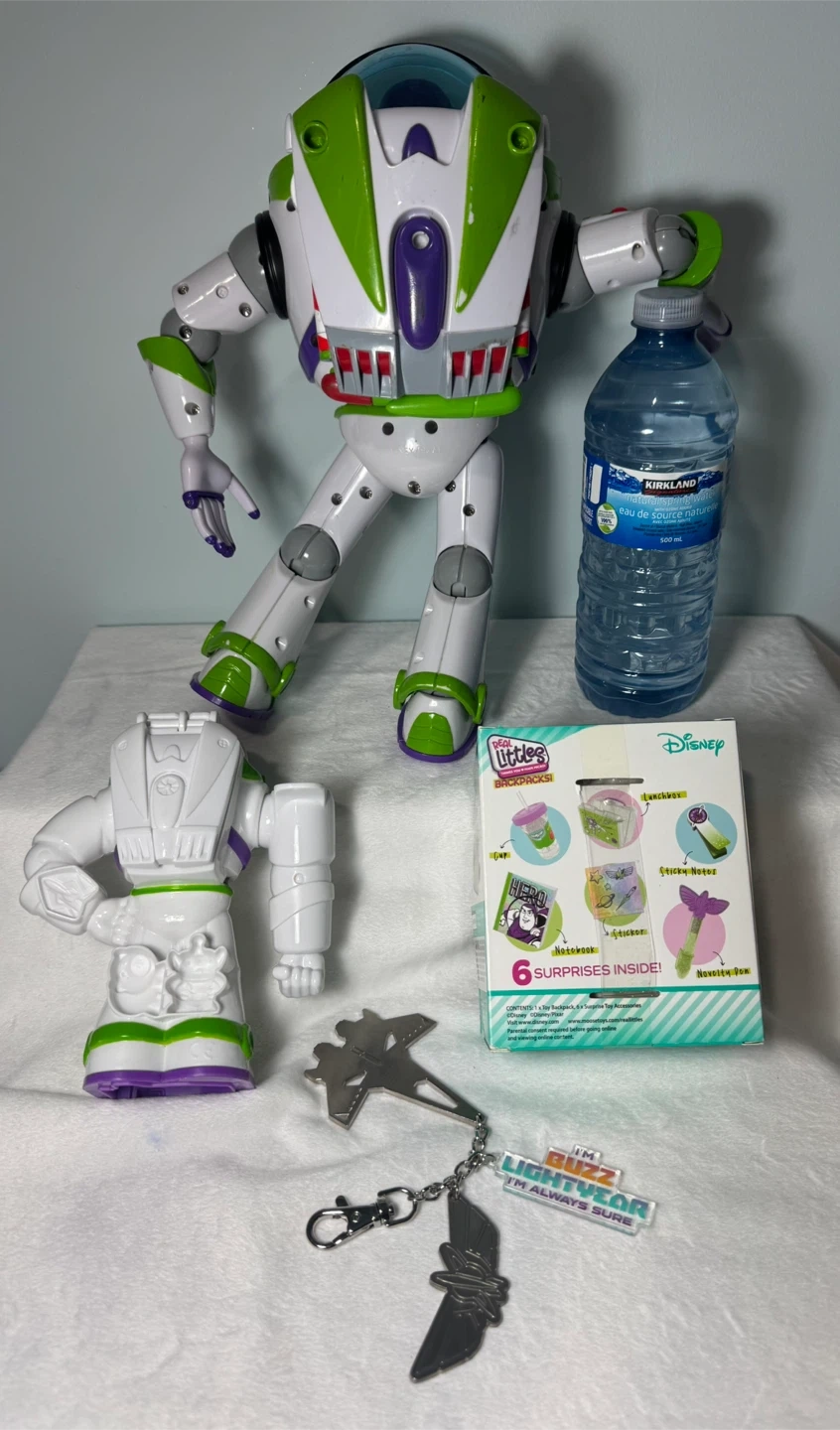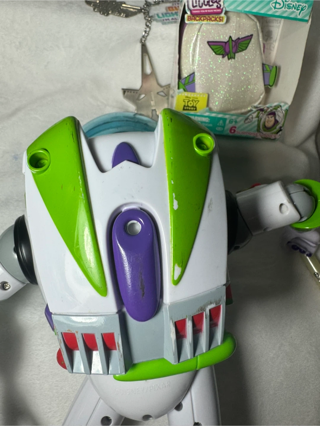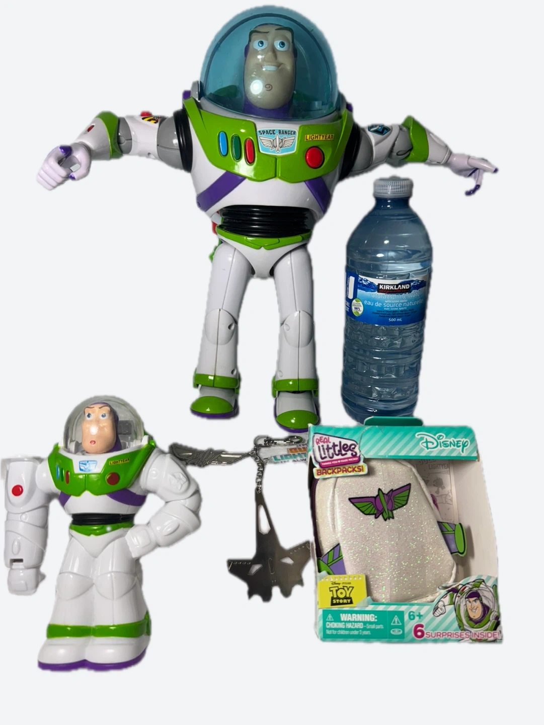 Selling a collection of Buzz Lightyear items from Disney's Toy Story! 1 Large size Buzz Lightyear action figure (good used condition) 1 smaller Buzz Lightyear play dough maker (good used condition) 1 Brand New (No tag) Buzz Lightyear keychain from Disneyland 1 Brand New Real Littles Backpack with 6 surprises inside! There’s 4 items in this listing. NOTE: SOLD as a set of 4 only. NO individual sale. Recommended for ages 6+