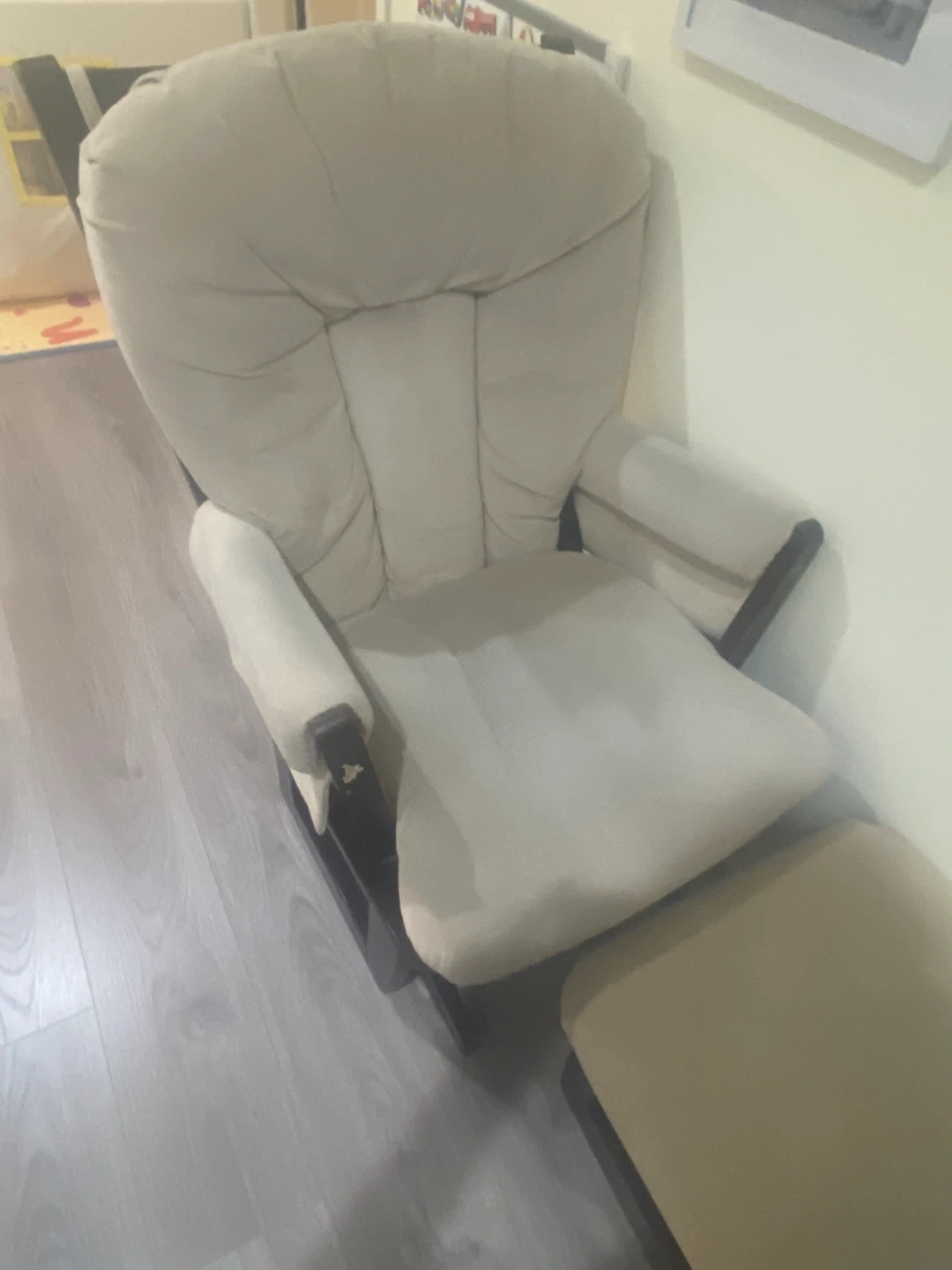 Selling a comfy rocking chair with a matching ottoman! It's perfect for relaxing or nursing. The chair is in used good condition and ready for a new home. It has a neutral beige colour that will fit in with any decor.