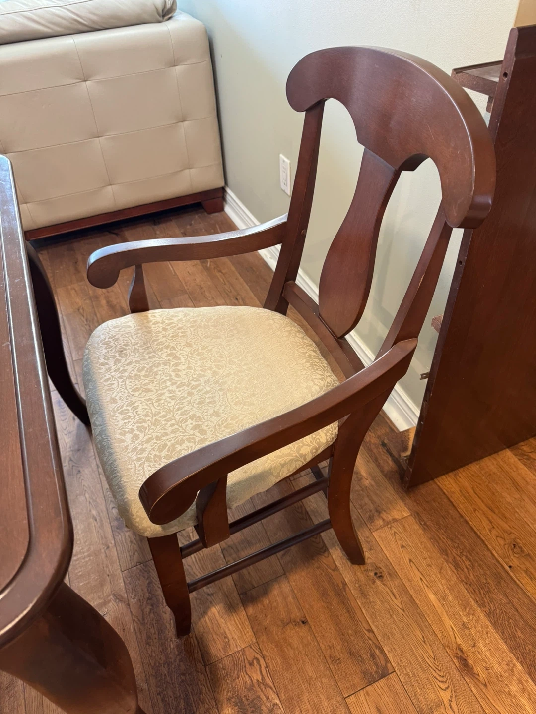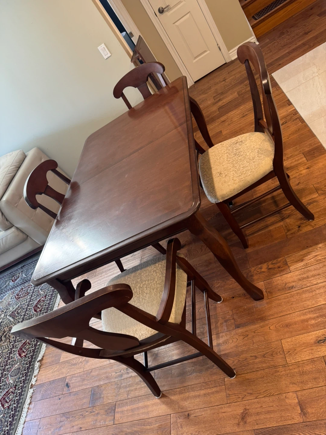 Selling a dining table with matching chairs. The set features a wooden table and chairs with a patterned fabric seat. It's in good condition and ready for a new home!