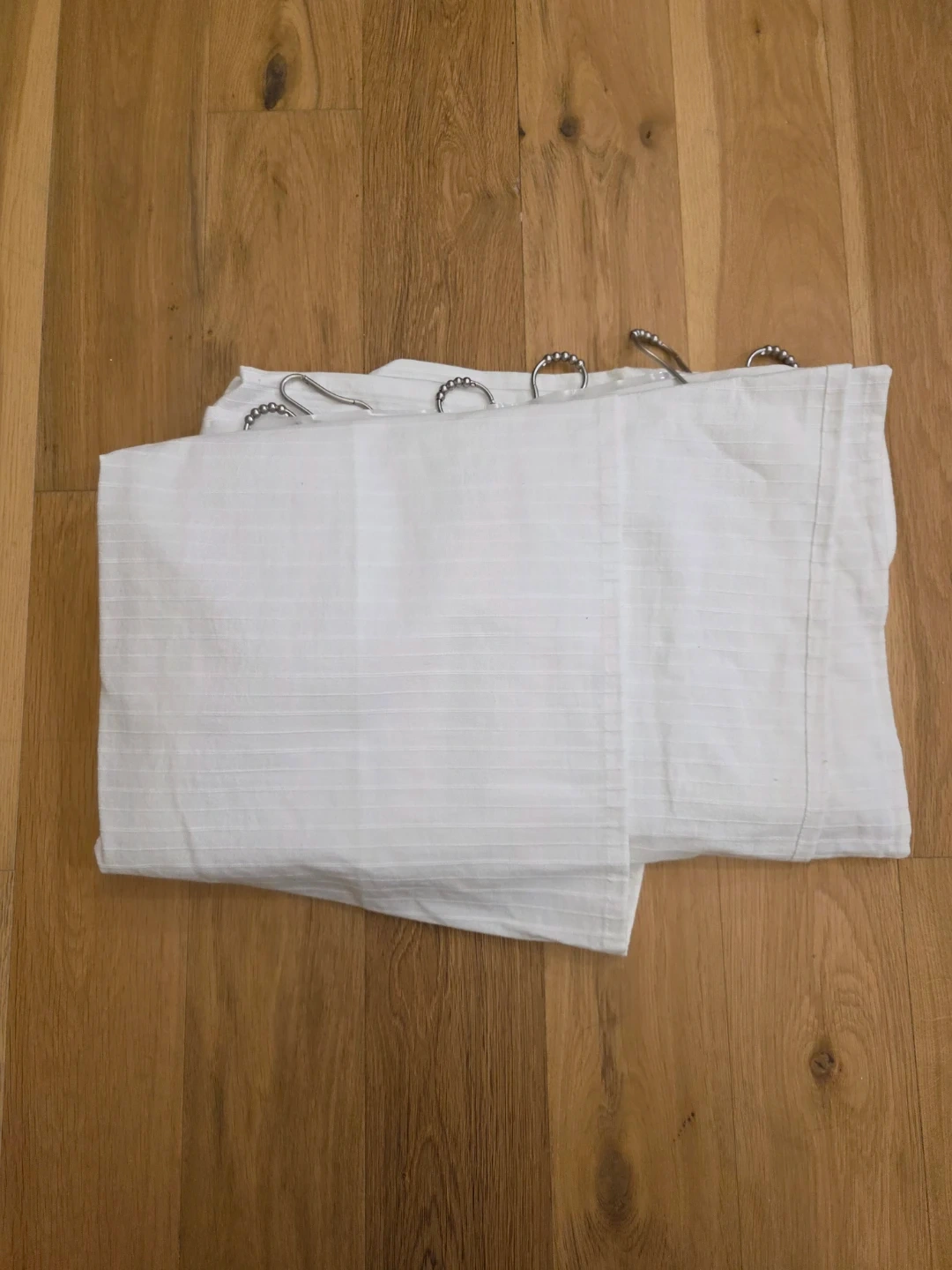 Both curtains were originally $25 each, so with the liners and rings, it's about a $70 value for much less! 💸 Both were used for less than 5 months and the completely white one was hardly used, so trust you're getting a great deal