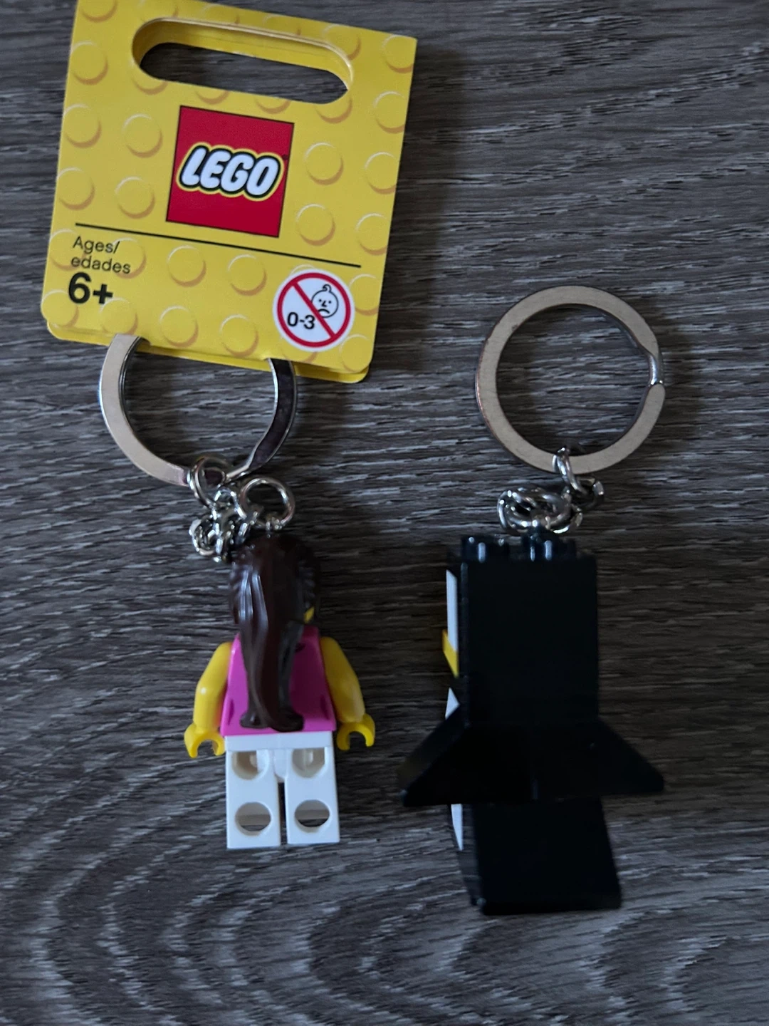Two LEGO minifigure keychains for sale! One is a girl minifigure with brown hair, a pink top, and white pants and new with a tag.