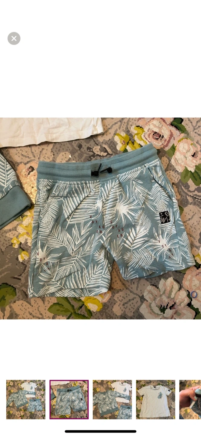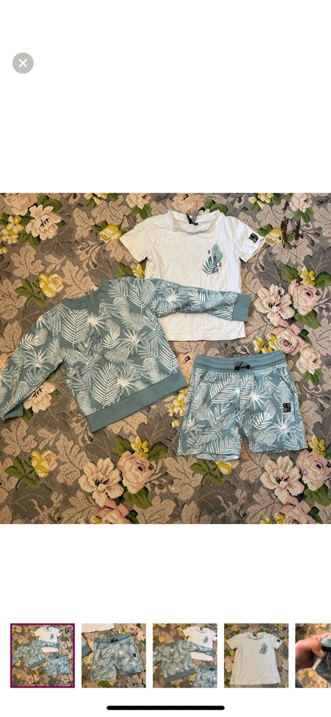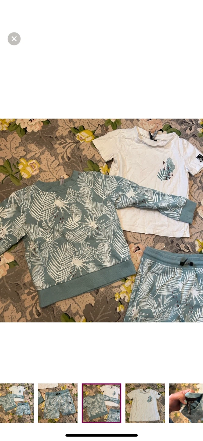Smallbone & Scot brand. 3pc matching set of pullover sweater, joggers shorts and short sleeve tshirt. Blue tropical print. Size 3. Brand new condition