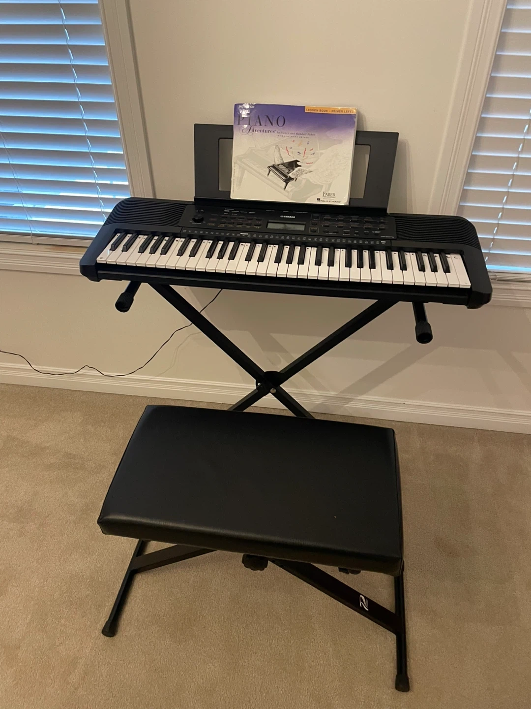 Selling a Yamaha PSR-E273 portable keyboard. It's a 61-key model that's great for beginners or anyone looking for a compact keyboard. Comes with a bench for comfortable playing.