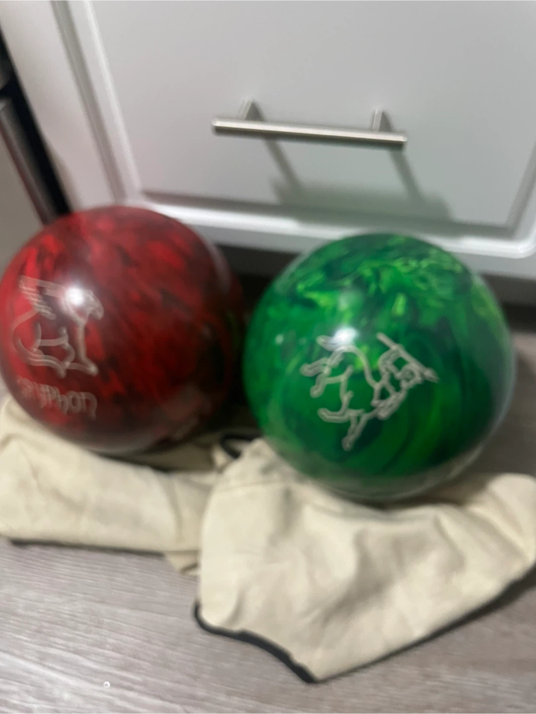 Selling two Motiv bowling balls, one in red and one in green. Both come with their own carrying bags. Ready for a new home!