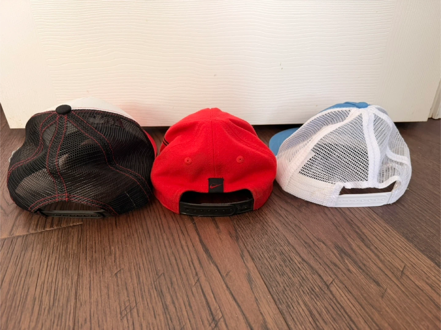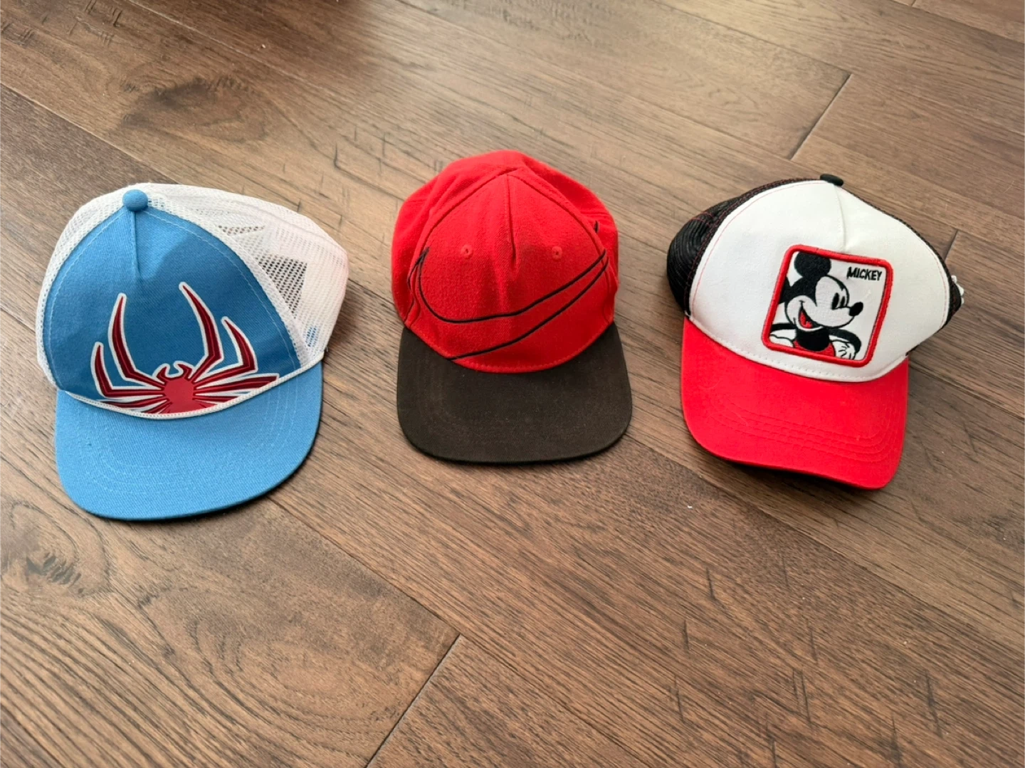 Selling a set of kid baseball caps (fits ages 4/5/6ish). There's a light blue Spiderman cap, a red and black Nike cap, and a red and white Mickey Mouse cap. They're all in great shape and ready for a new home!