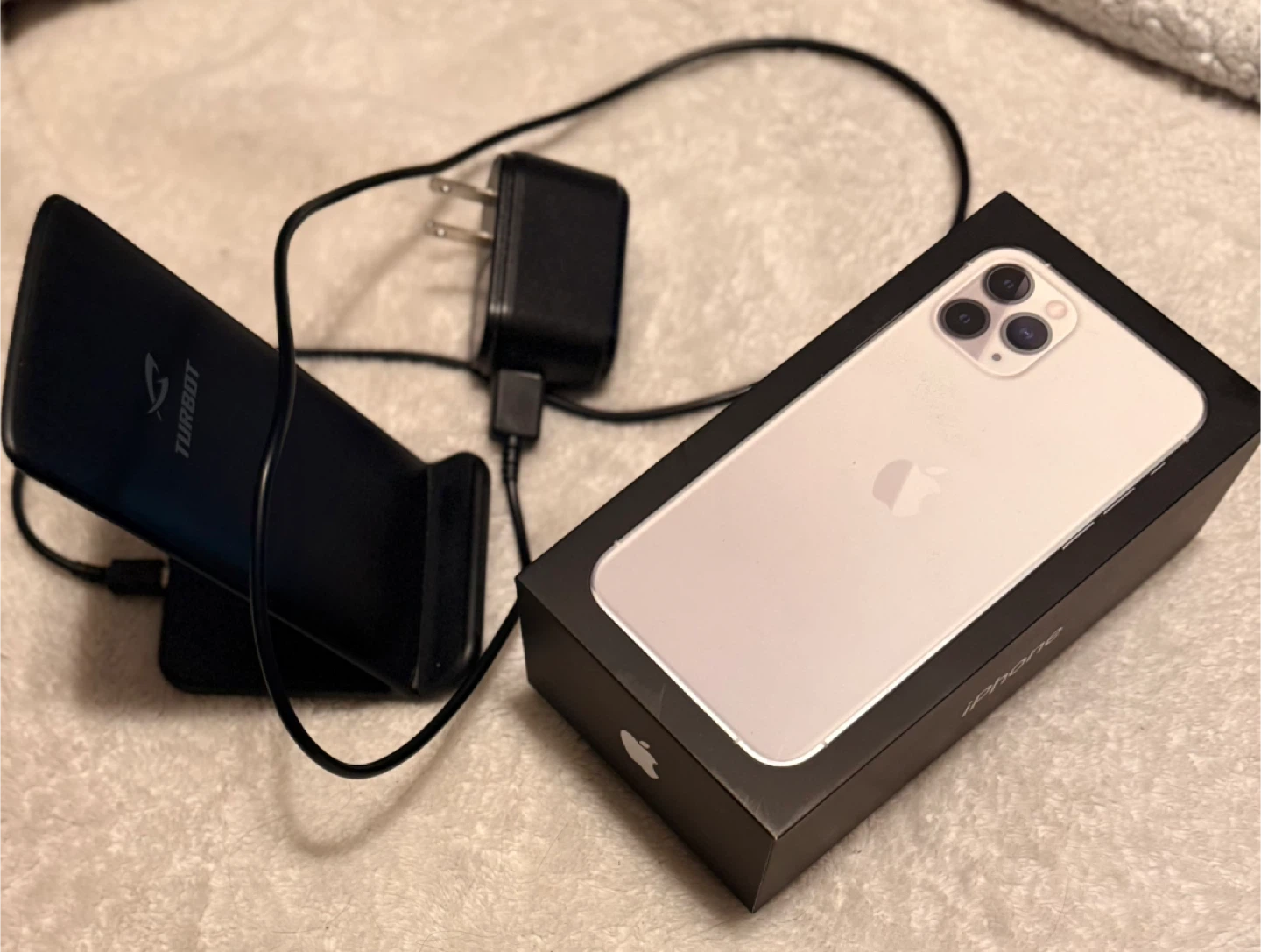 Selling an iPhone 11 Pro Max in good condition, along with a Spigen case. The phone comes with its original box and accessories. Includes a charger and headphones