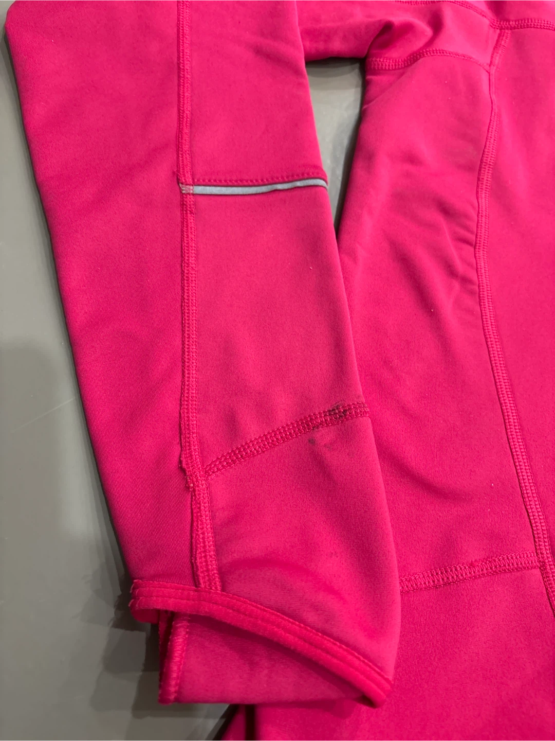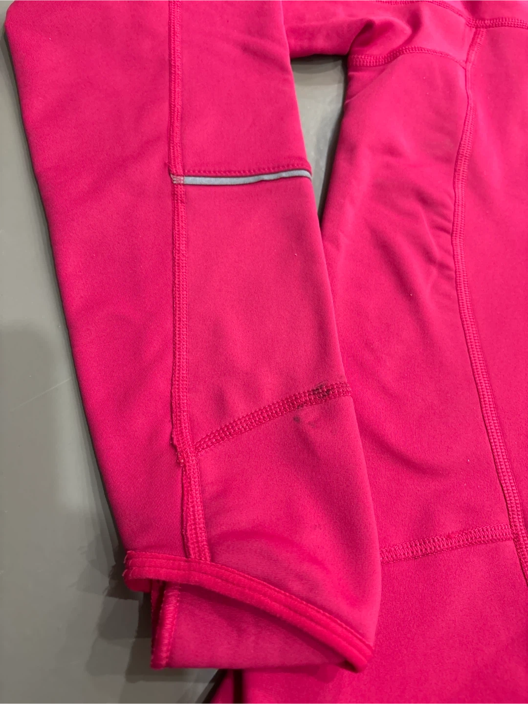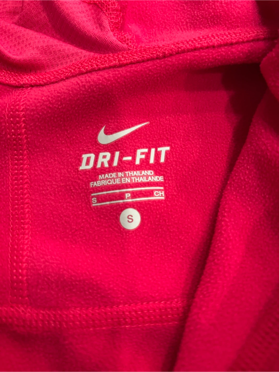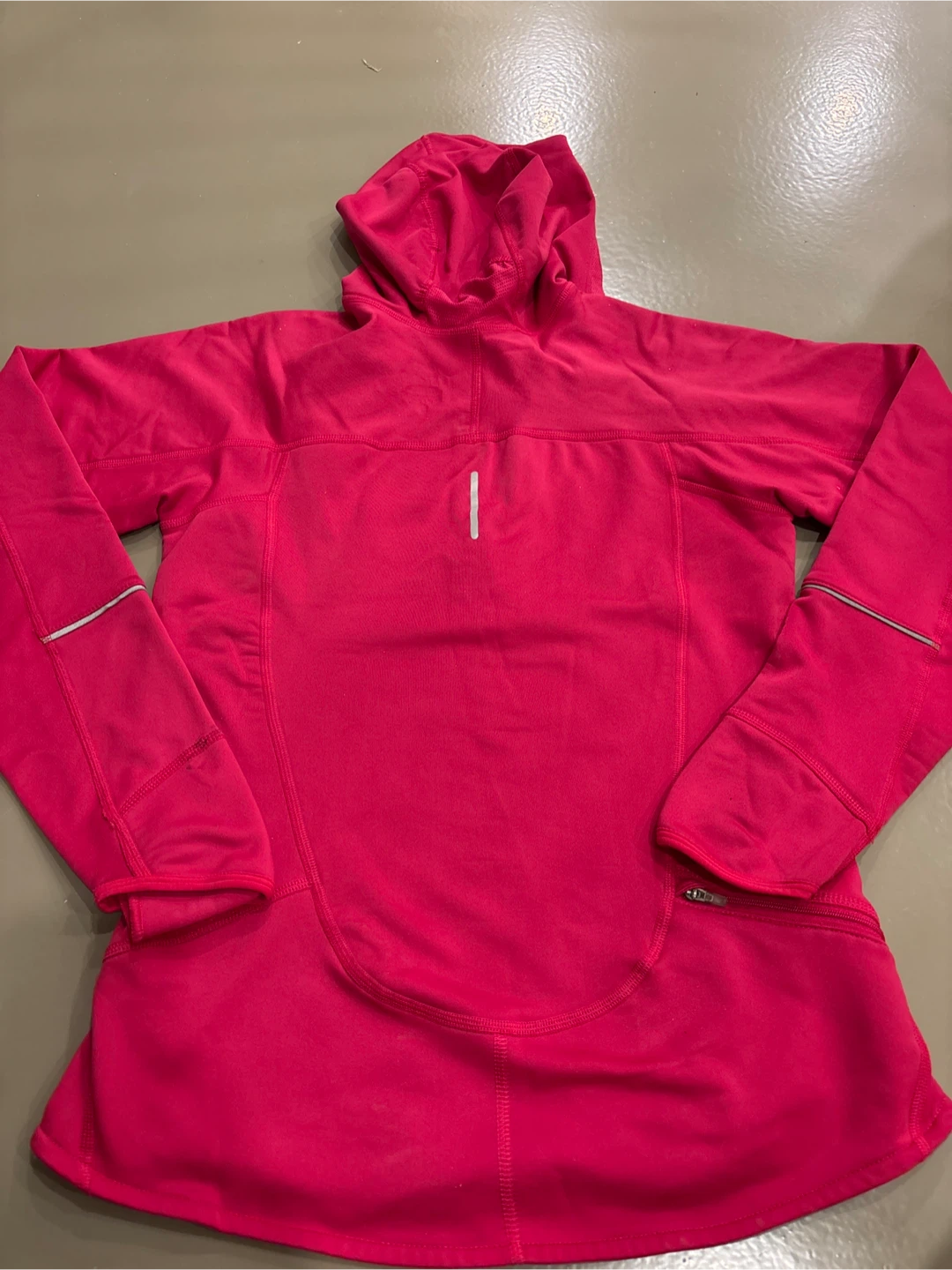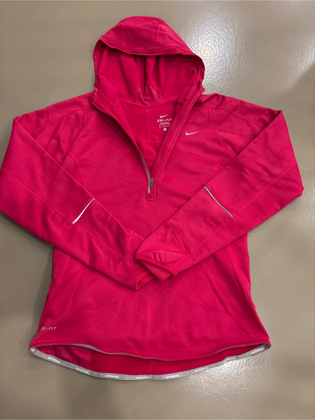 Selling a Nike Dri-FIT running hoodie in a vibrant pink colour! It's a size small and perfect for staying comfortable during your runs. There is one mark on the sleeve as per the picture but it's still in great condition.