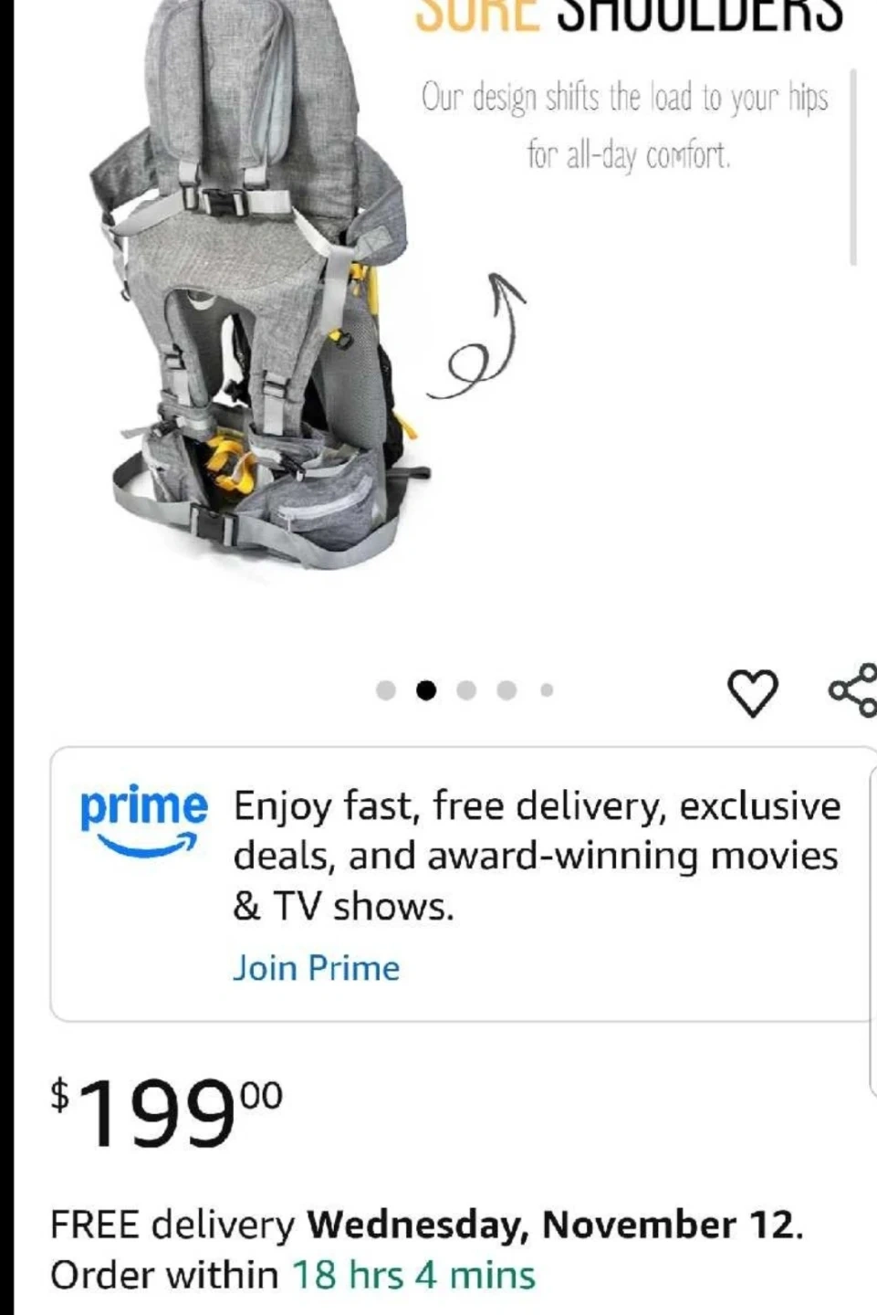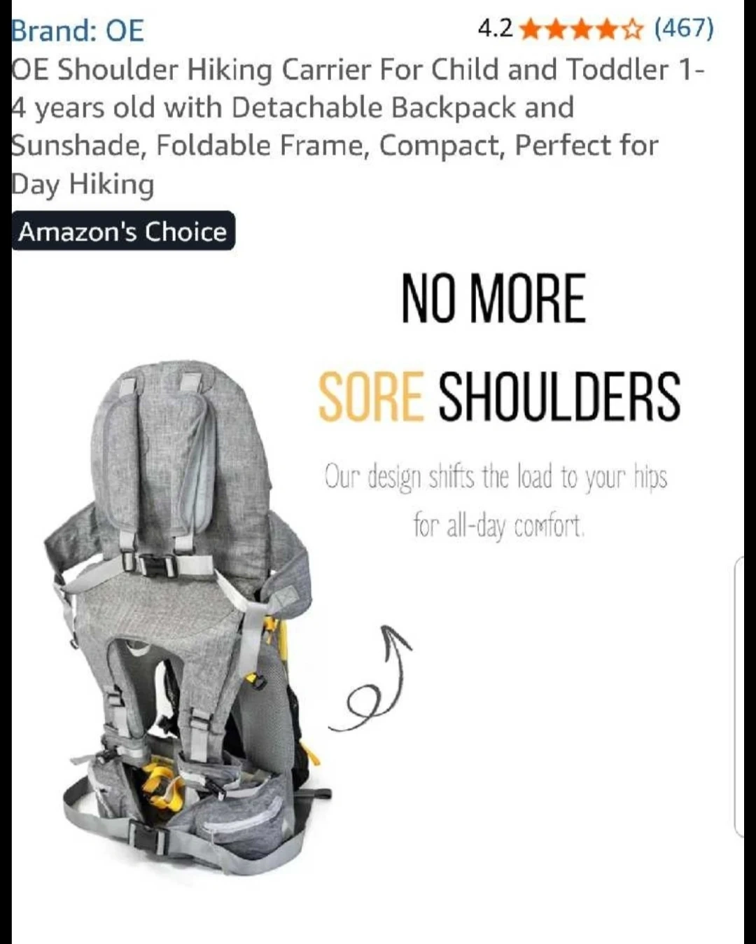 288Brand new in box Xp pick up Bovard and Dixie area of Brampton OE Shoulder Hiking Carrier For Child and Toddler 1-4 years old with Detachable Backpack and Sunshade, Foldable Frame, Compact, Perfect for Day Hiking This carrier fits people's torso length (from hip bone to top of shoulder) ranging from 38cm to 59cm. If you fall out of the range, please contact us through our website for customization Great for Walks, Hikes, Travel, Amusement parks and other Outdoor Activity Fold-able design makes it more practical in daily life. You can use it as a diaper/hiking bag when not carrying your child. Please go to www.oecarrier.com for more info and instructions https://www.amazon.ca/OE-child-shoulder-carrier-Expedition/dp/B07YSXLFG9