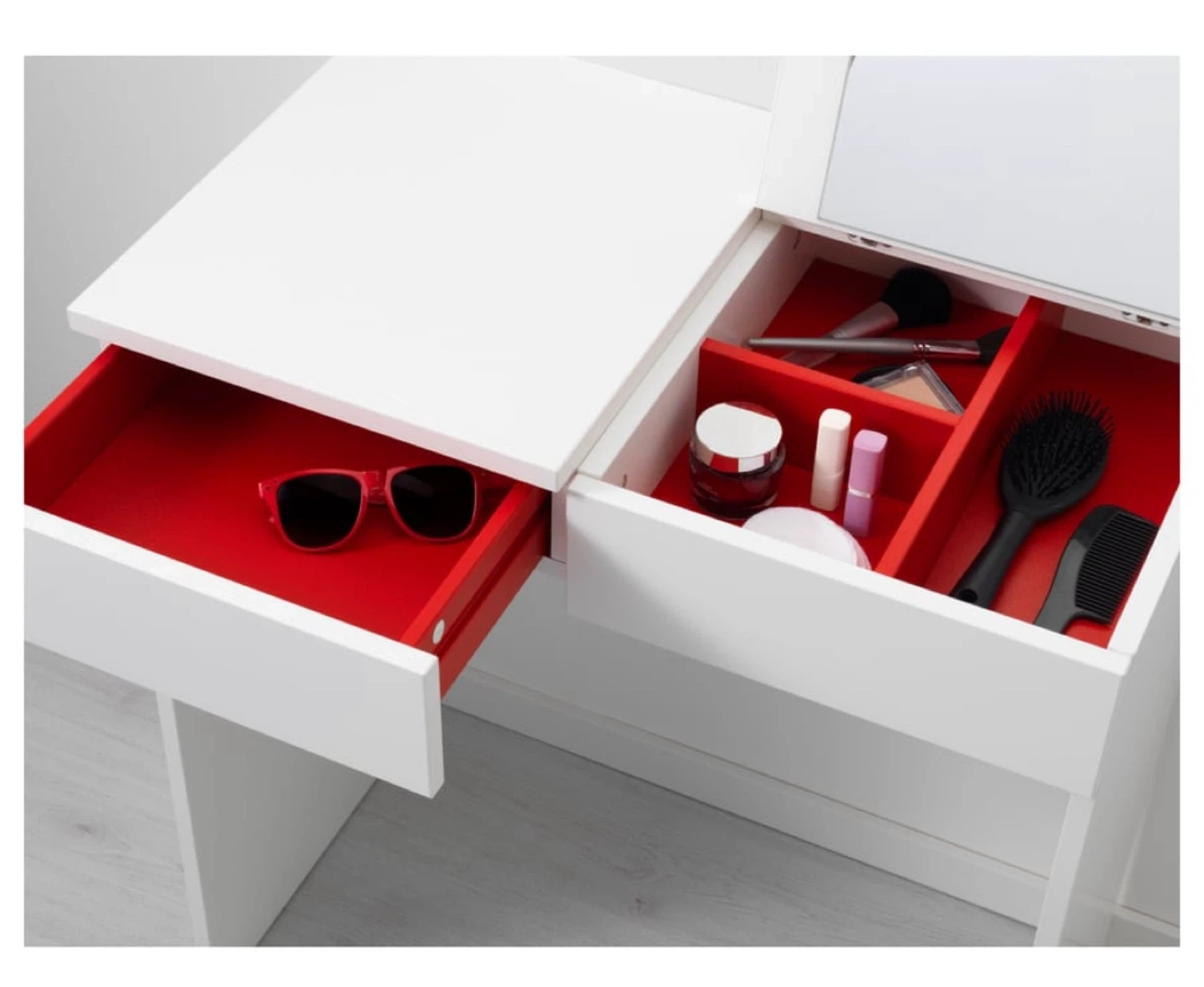 Selling a white IKEA Hemnes vanity table. It’s in great condition and perfect for a small space. The drawers are lined with red felt, adding a nice pop of colour!
