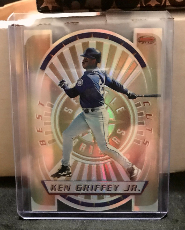 I'm offering a 1996 Bowman's Best Cuts Refractor #1 card featuring Ken Griffey Jr. of the Mariners. This card is in excellent condition, encased to preserve its condition, making it a special addition for any baseball card collector. A rare find for fans of "The Kid!"