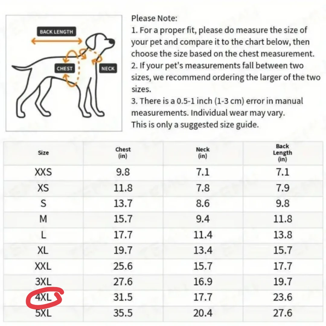 The size is 4XL. Please refer to the size chart in the photos to ensure the right fit for your pet.