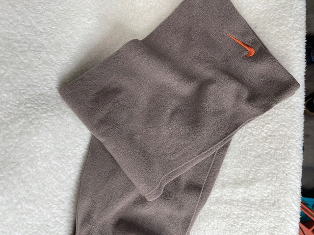 278Stay warm and stylish with this brown Nike scarf, perfect for those chilly days! It features the iconic Nike swoosh embroidered in orange, adding a sporty touch to your winter wardrobe. This scarf is in used condition. * Brand: Nike * Colour: Brown with orange logo * Material: Fleece * Style: Winter Scarf