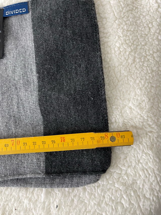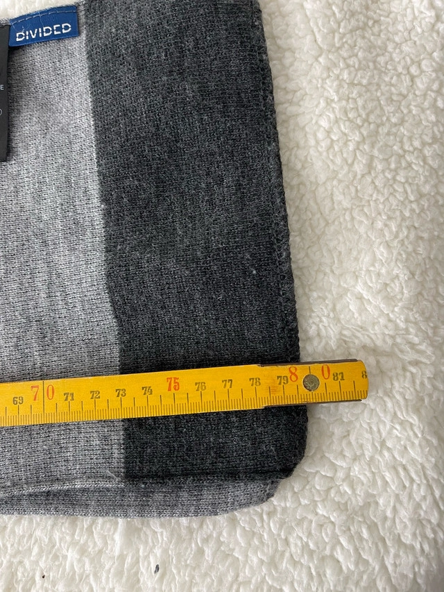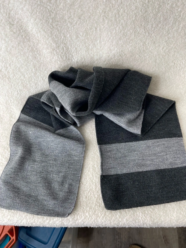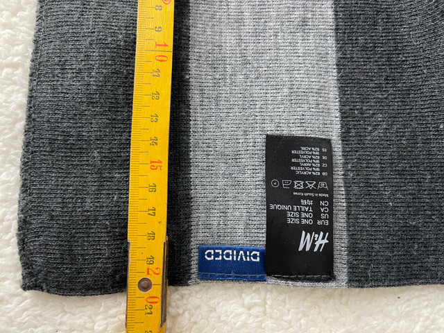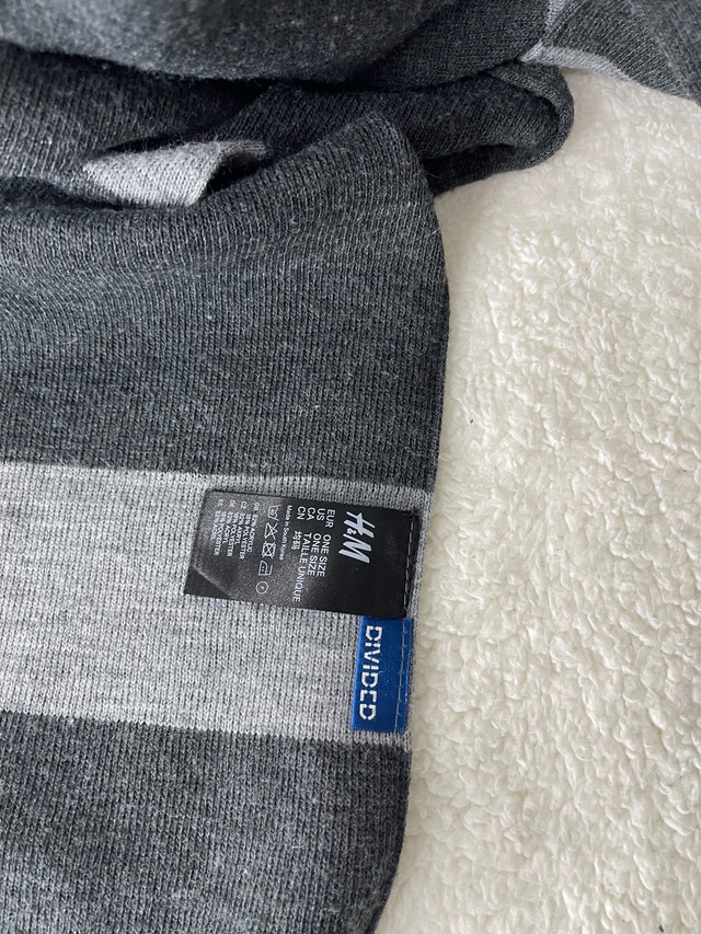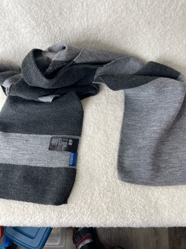 Stay warm and stylish this winter with this H&M grey striped scarf. This used scarf is made from a soft, comfortable knit material and features a classic striped pattern in various shades of grey. It's in good condition and ready to keep you cozy all season long.