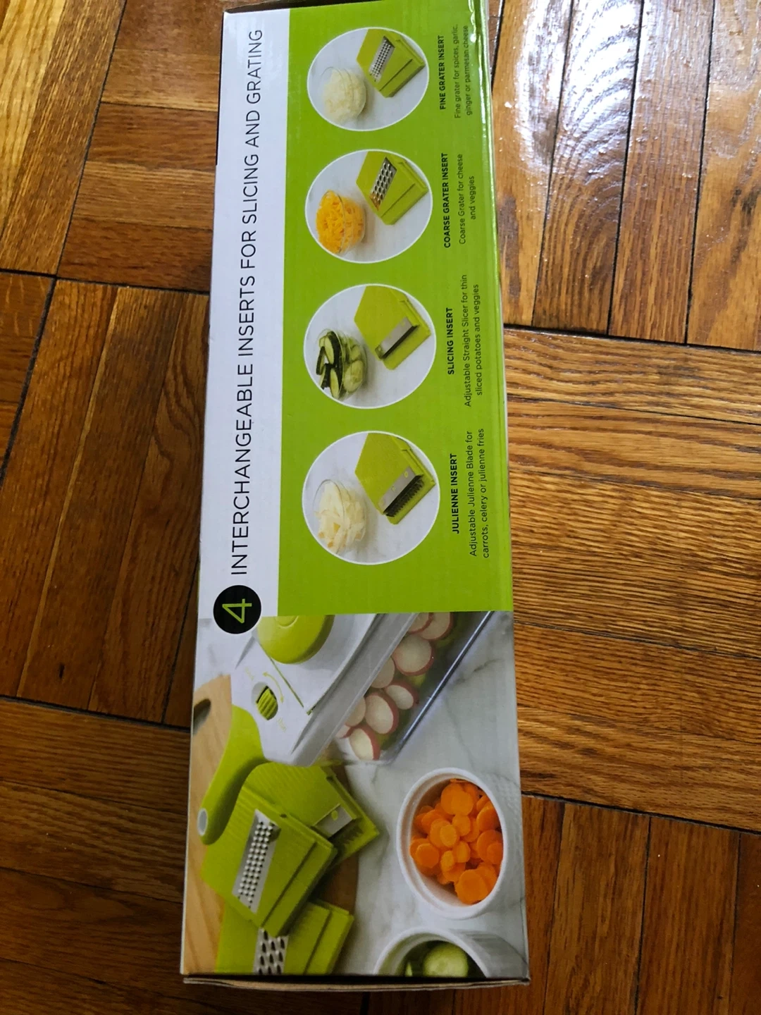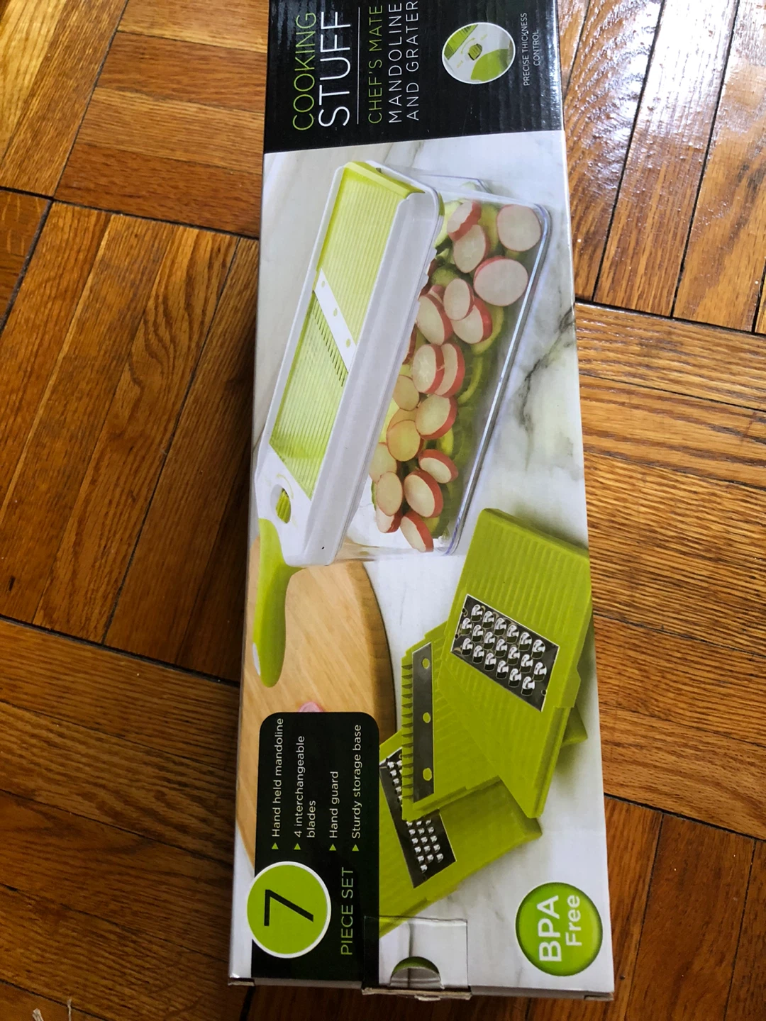 Selling a brand new Cooking Stuff Chef's Mate Mandoline and Grater! This is a 7-piece set with interchangeable blades for slicing and grating. It includes a hand-held mandoline, hand guard, and sturdy storage base. BPA free!
