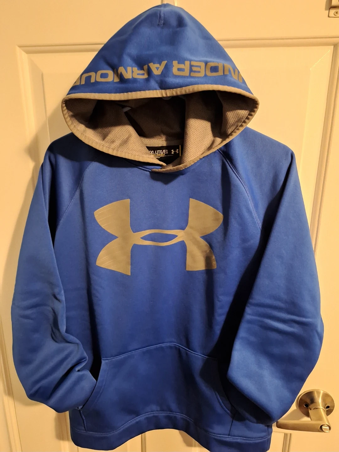 Selling a blue Under Armour hoodie in youth size XL. It's new, perfect for staying warm on cooler days. There is a small stain on the front, as pictured.