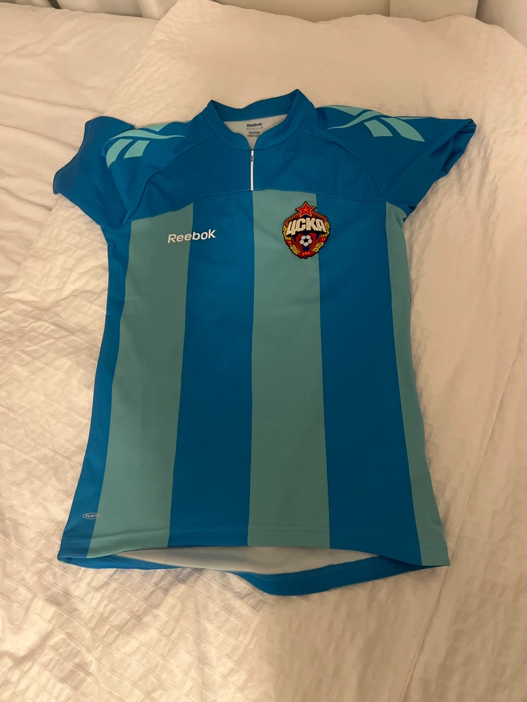 Here's a Reebok CSKA Moscow soccer jersey in a vibrant blue colour! It features the CSKA Moscow logo and Reebok branding. A great addition for any soccer fan or collector!