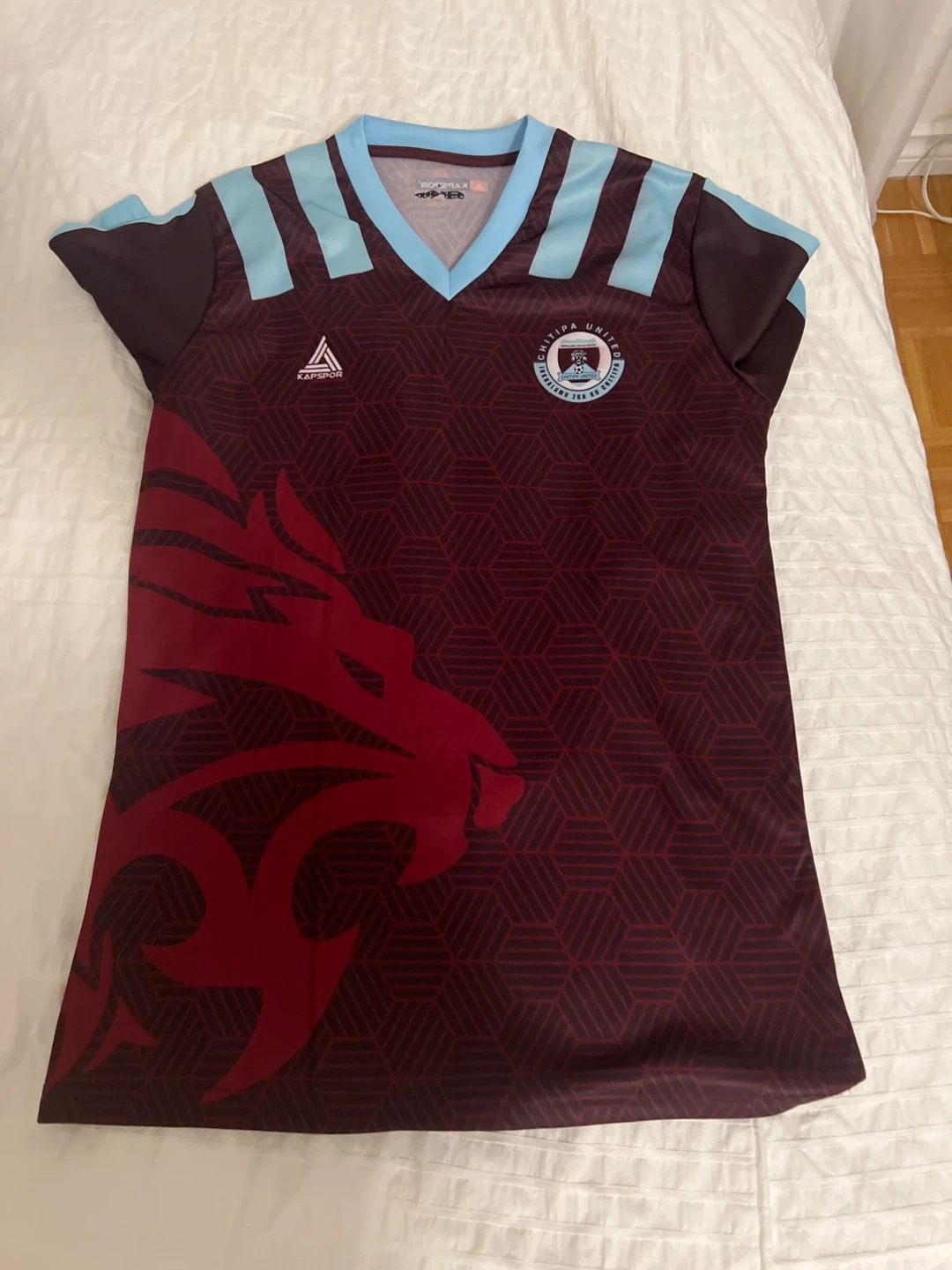 Selling a Chitipa United soccer jersey by Kapspor. It features a unique design with a lion graphic and geometric patterns. The jersey is in great condition!