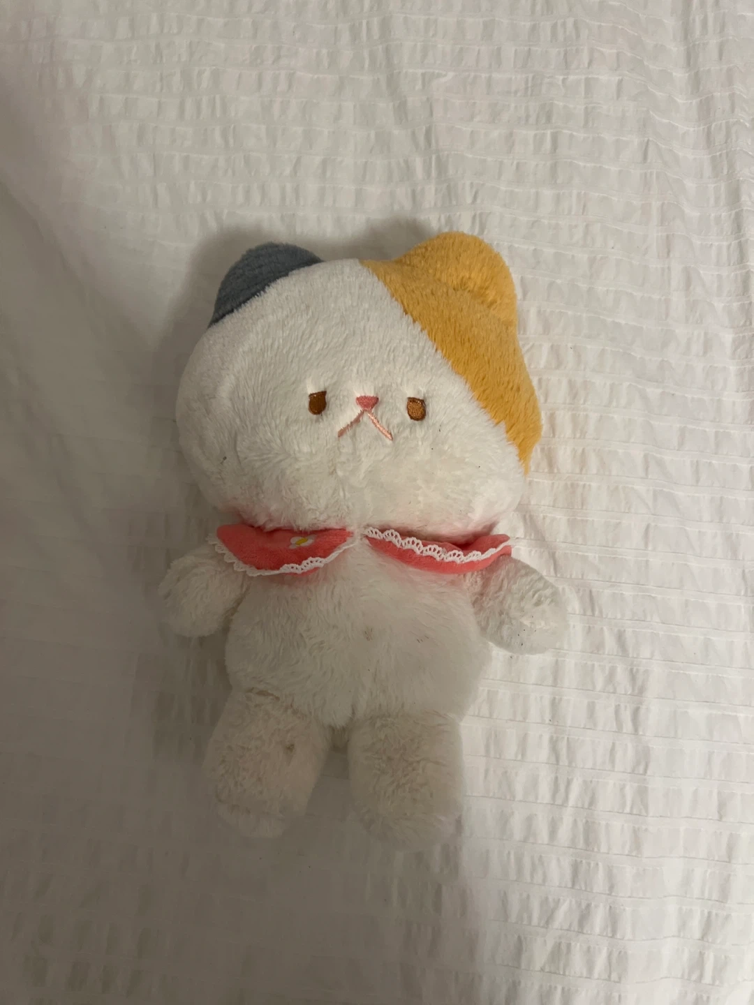 Selling a cute cat plushie! It has a little collar and is very soft. It has a white body with yellow and blue markings on its head. It may have some minor signs of wear.