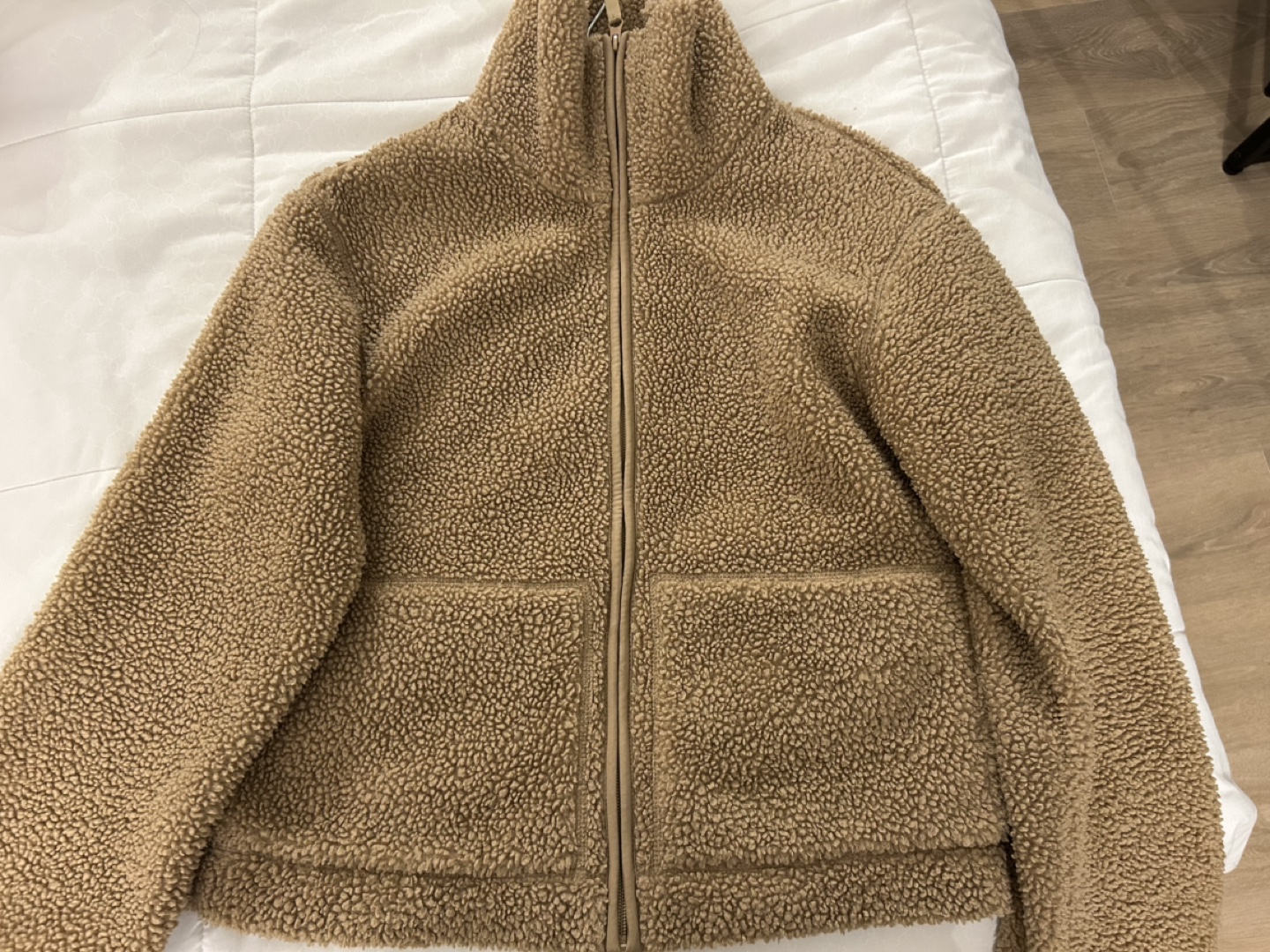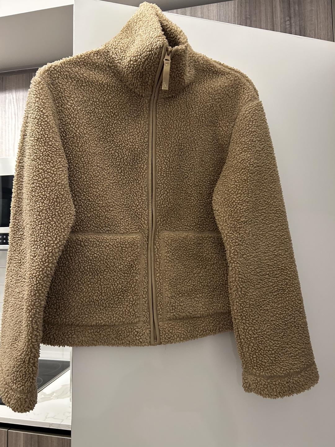 Cozy teddy full zip jacket! It's in great condition, (used a couple of times) and perfect for layering or wearing on its own on milder days. The teddy material is so soft and comfortable, you'll love it!